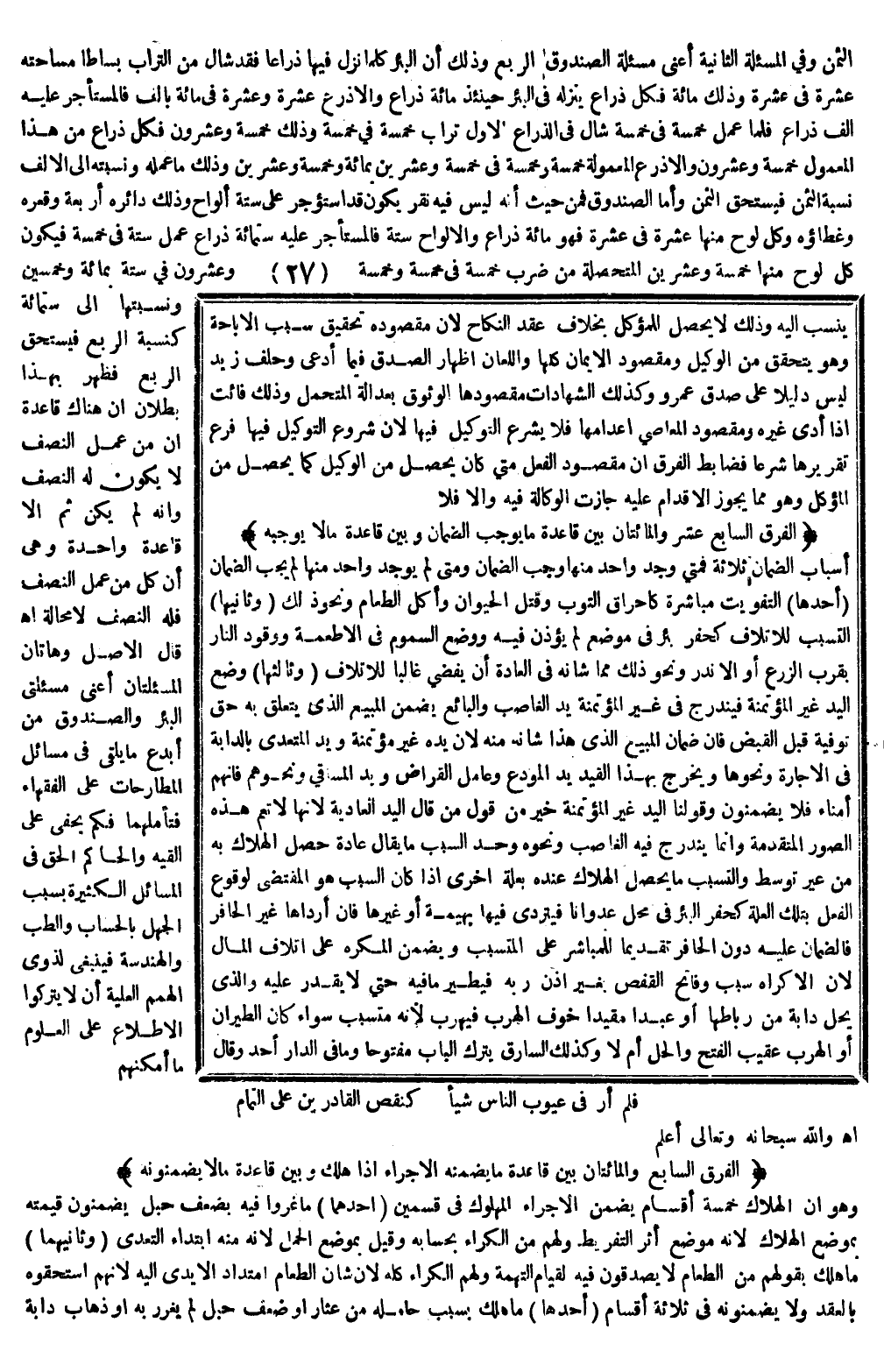 قَالَ الْأَصْلُ، وَهَاتَانِ الْمَسْأَلَتَانِ أَعْنِي: مَسْأَلَتَيْ الْبِئْرِ وَالصُّنْدُوقِ مِنْ أَبْدَعِ مَا يُلْقَى فِي مَسَائِلِ الْمُطَارَحَاتِ عَلَى الْفُقَهَاءِ فَتَأَمَّلْهُمَا فَكَمْ يَخْفَى عَلَى الْفَقِيهِ وَالْحَاكِمِ الْحَقُّ فِي الْمَسَائِلِ الْكَثِيرَةِ بِسَبَبِ الْجَهْلِ بِالْحِسَابِ وَالطِّبِّ وَالْهَنْدَسَةِ فَيَنْبَغِي لِذَوِي الْهِمَمِ الْعَلِيَّةِ أَنْ لَا يَتْرُكُوا الِاطِّلَاعَ عَلَى الْعُلُومِ مَا أَمْكَنَهُمْ: