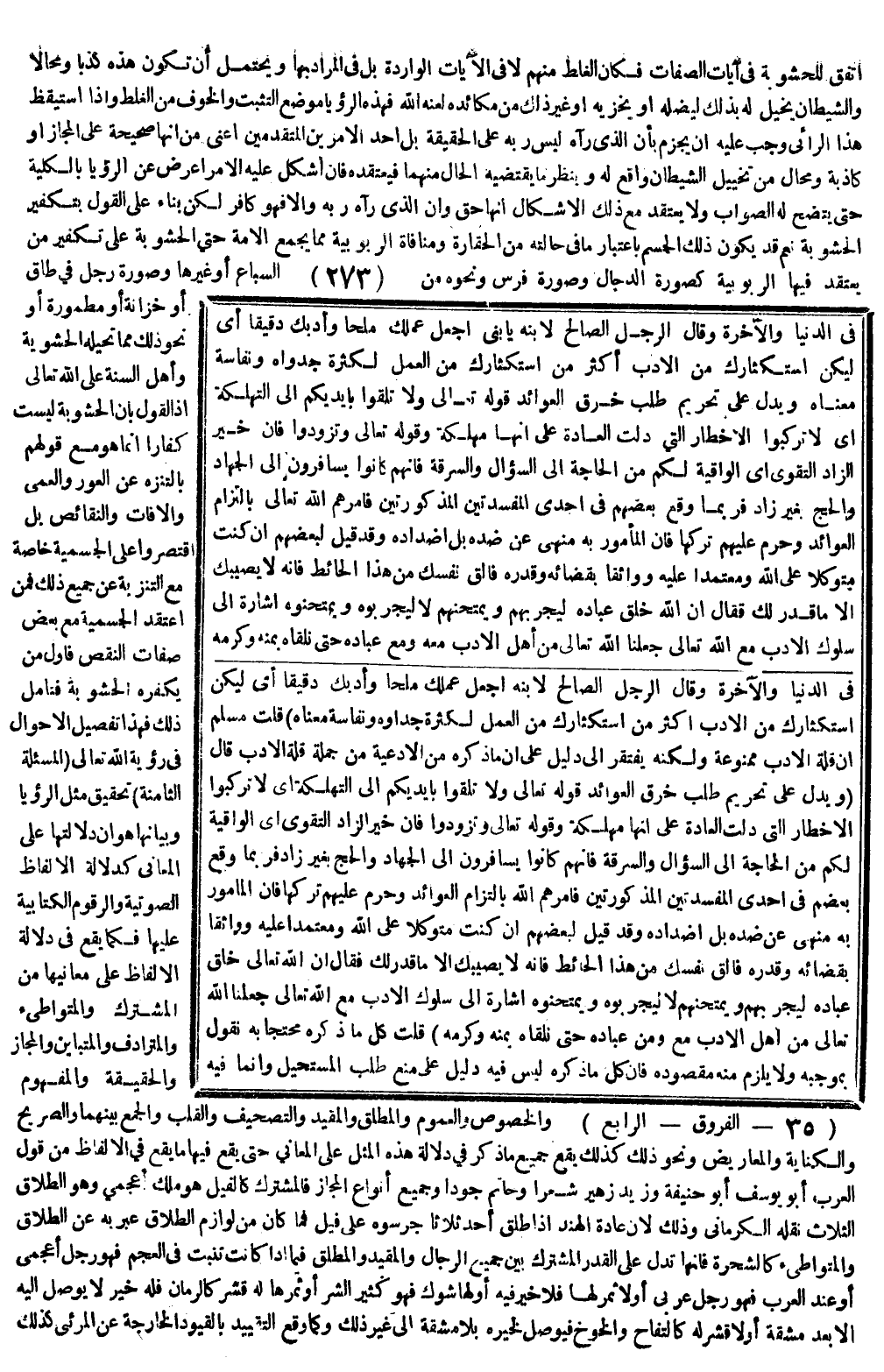 ـــــــــــــــــــــــــــــQاتَّفَقَ لِلْحَشَوِيَّةِ فِي آيَاتِ الصِّفَاتِ فَكَانَ الْغَلَطُ مِنْهُمْ لَا فِي الْآيَاتِ الْوَارِدَةِ بَلْ فِي الْمُرَادِ بِهَا، وَيُحْتَمَلُ أَنْ تَكُونَ هَذِهِ كَذِبًا وَمُحَالًا، وَالشَّيْطَانُ يُخَيِّلُ لَهُ بِذَلِكَ لِيَضِلَّهُ أَوْ يُخْزِيَهُ، أَوْ غَيْرُ ذَلِكَ مِنْ مَكَائِدِهِ - لَعَنَهُ اللَّهُ - فَهَذِهِ الرُّؤْيَا مَوْضِعُ التَّثَبُّتِ وَالْخَوْفِ مِنْ الْغَلَطِ، وَإِذَا اسْتَيْقَظَ هَذَا الرَّائِي وَجَبَ عَلَيْهِ أَنْ يَجْزِمَ بِأَنَّ الَّذِي رَآهُ لَيْسَ رَبَّهُ عَلَى الْحَقِيقَةِ بَلْ أَحَدُ الْأَمْرَيْنِ الْمُتَقَدِّمَيْنِ أَعْنِي مِنْ أَنَّهَا صَحِيحَةٌ عَلَى الْمَجَازِ، أَوْ كَاذِبَةٌ وَمُحَالٌ مِنْ تَخْيِيلِ الشَّيْطَانِ وَاقِعٌ لَهُ وَيَنْظُرُ مَا يَقْتَضِيهِ الْحَالُ مِنْهُمَا فَيَعْتَقِدُهُ فَإِنْ أَشْكَلَ عَلَيْهِ الْأَمْرُ أَعْرَضَ عَنْ الرُّؤْيَا بِالْكُلِّيَّةِ حَتَّى يَتَّضِحَ لَهُ الصَّوَابُ، وَلَا يَعْتَقِدَ مَعَ ذَلِكَ الْإِشْكَالِ أَنَّهَا حَقٌّ، وَأَنَّ الَّذِي رَآهُ رَبُّهُ، وَإِلَّا فَهُوَ كَافِرٌ لَكِنْ بِنَاءً عَلَى الْقَوْلِ بِتَكْفِيرِ الْحَشَوِيَّةِ نَعَمْ قَدْ يَكُونُ ذَلِكَ الْجِسْمُ بِاعْتِبَارِ مَا فِي حَالَتِهِ مِنْ الْحَقَارَةِ وَمُنَافَاةِ الرُّبُوبِيَّةِ مِمَّا يُجْمِعُ الْأُمَّةُ حَتَّى الْحَشَوِيَّةَ عَلَى التَّكْفِيرِ مَنْ يَعْتَقِدُ فِيهَا الرُّبُوبِيَّةَ كَصُورَةِ الدَّجَّالِ وَصُورَةِ فَرَسٍ وَنَحْوِهِ مِنْ السِّبَاعِ أَوْ غَيْرِهَا وَصُورَةِ رَجُلٍ فِي طَاقٍ أَوْ خِزَانَةٍ أَوْ مَطْمُورَةٍ أَوْ نَحْوِ ذَلِكَ مِمَّا تُحِيلُهُ الْحَشَوِيَّةُ وَأَهْلُ السُّنَّةِ عَلَى اللَّهِ - تَعَالَى؛ إذْ الْقَوْلُ بِأَنَّ الْحَشَوِيَّةَ لَيْسَتْ كُفَّارًا إنَّمَا هُوَ مَعَ قَوْلِهِمْ بِالتَّنَزُّهِ عَنْ الْعَوَرِ وَالْعَمَى وَالْآفَاتِ وَالنَّقَائِصِ بَلْ اقْتَصَرُوا عَلَى الْجِسْمِيَّةِ خَاصَّةً مَعَ التَّنْزِيهِ عَنْ جَمِيعِ ذَلِكَ فَمَنْ اعْتَقَدَ الْجِسْمِيَّةَ مَعَ بَعْضِ صِفَاتِ النَّقْصِ، فَأَوَّلُ مَنْ يُكَفِّرُهُ الْحَشَوِيَّةُ فَتَأَمَّلْ ذَلِكَ فَهَذَا تَفْصِيلُ الْأَحْوَالِ فِي رُؤْيَةِ اللَّهِ - تَعَالَى -.