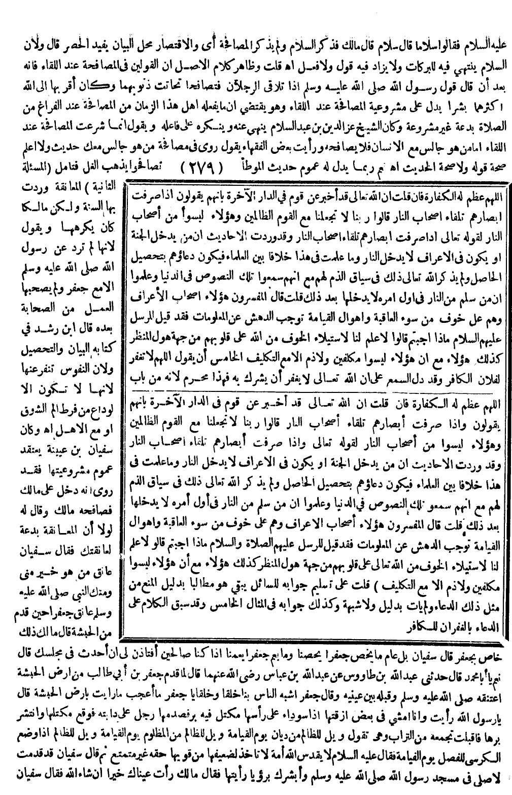وَهُوَ يَقْتَضِي أَنَّ مَا يَفْعَلُهُ أَهْلُ هَذَا الزَّمَانِ مِنْ الْمُصَافَحَةِ عِنْدَ الْفَرَاغِ مِنْ الصَّلَاةِ بِدْعَةٌ غَيْرُ مَشْرُوعَةٍ، وَكَانَ الشَّيْخُ عِزُّ الدِّينِ بْنُ عَبْدِ السَّلَامِ يُنْهِي عَنْهُ وَيُنْكِرُهُ عَلَى فَاعِلِهِ، وَيَقُولُ: إنَّمَا شُرِعَتْ الْمُصَافَحَةُ عِنْدَ اللِّقَاءِ أَمَّا مَنْ هُوَ جَالِسٌ مَعَ الْإِنْسَانِ فَلَا يُصَافِحُهُ وَرَأَيْت بَعْضَ الْفُقَهَاءِ يَقُولُ: رُوِيَ فِي مُصَافَحَةِ مَنْ هُوَ جَالِسٌ مَعَك حَدِيثٌ، وَلَا أَعْلَمُ صِحَّةَ قَوْلِهِ، وَلَا صِحَّةَ الْحَدِيثِ اهـ نَعَمْ رُبَّمَا يَدُلُّ لَهُ عُمُومُ حَدِيثِ الْمُوَطَّإِ «تَصَافَحُوا يَذْهَبْ الْغِلُّ» فَتَأَمَّلْ.