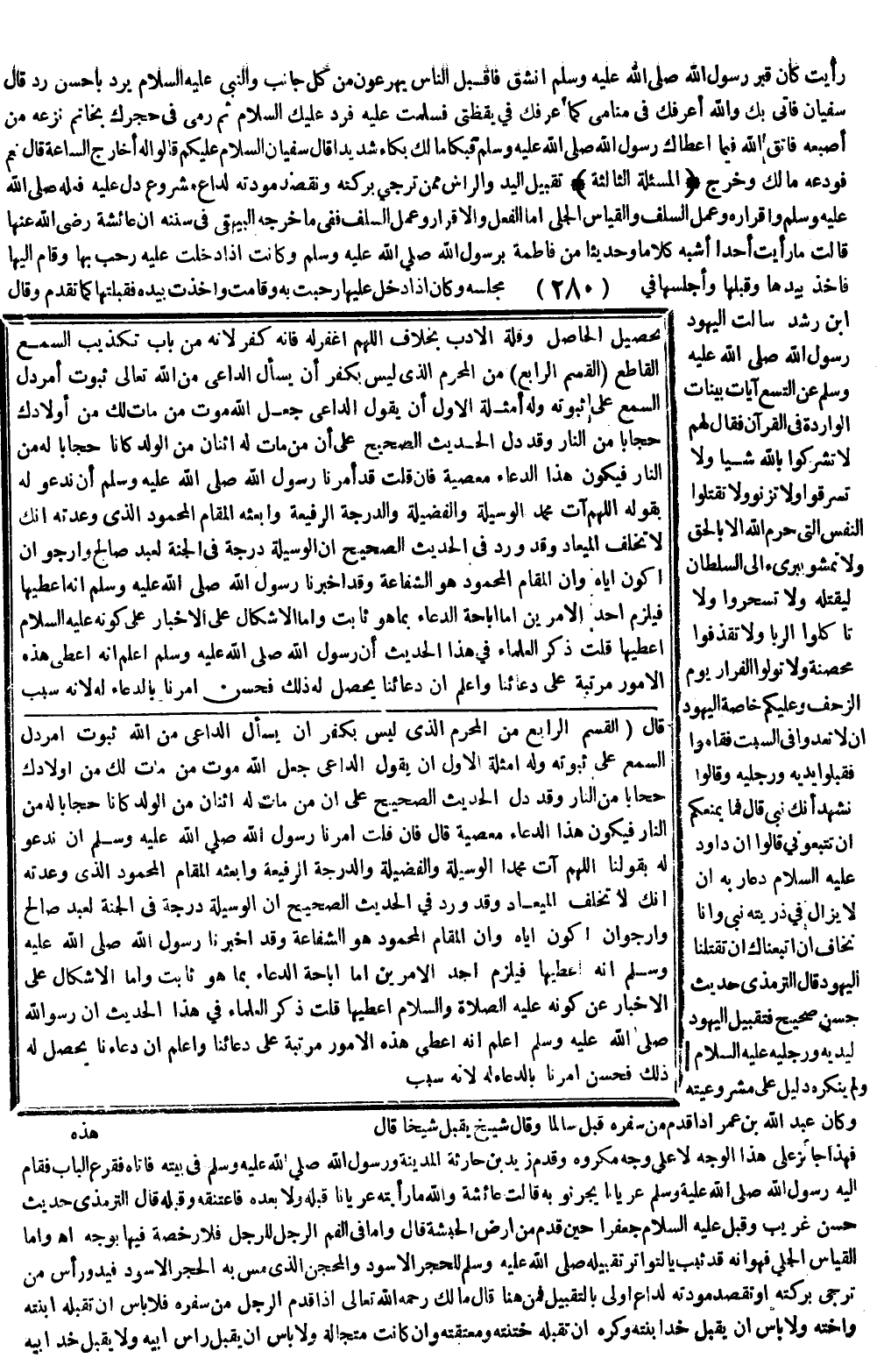 . (الْقِسْمُ الرَّابِعُ) مِنْ الْمُحَرَّمِ الَّذِي لَيْسَ بِكُفْرٍ أَنْ يَسْأَلَ الدَّاعِي مِنْ اللَّهِ تَعَالَى ثُبُوتَ أَمْرٍ دَلَّ السَّمْعُ عَلَى ثُبُوتِهِ وَلَهُ أَمْثِلَةٌ: الْأَوَّلُ أَنْ يَقُولَ الدَّاعِي جَعَلَ اللَّهُ مَوْتَ مَنْ مَاتَ لَك مِنْ أَوْلَادِك حِجَابًا مِنْ النَّارِ، وَقَدْ دَلَّ الْحَدِيثُ الصَّحِيحُ عَلَى أَنَّ «مَنْ مَاتَ لَهُ اثْنَانِ مِنْ الْوَلَدِ كَانَا حِجَابًا لَهُ مِنْ النَّارِ» فَيَكُونُ هَذَا الدُّعَاءُ مَعْصِيَةً، فَإِنْ قُلْت قَدْ أَمَرَنَا رَسُولُ اللَّهِ - صَلَّى اللَّهُ عَلَيْهِ وَسَلَّمَ - أَنْ نَدْعُوَ لَهُ بِقَوْلِهِ اللَّهُمَّ آتِ مُحَمَّدًا الْوَسِيلَةَ وَالْفَضِيلَةَ وَالدَّرَجَةَ الرَّفِيعَةَ وَابْعَثْهُ الْمَقَامَ الْمَحْمُودَ الَّذِي وَعَدْته إنَّك لَا تُخْلِفُ الْمِيعَادَ، وَقَدْ وَرَدَ فِي الْحَدِيثِ الصَّحِيحِ أَنَّ الْوَسِيلَةَ دَرَجَةٌ فِي الْجَنَّةِ لِعَبْدٍ صَالِحٍ وَأَرْجُو أَنْ أَكُونَ إيَّاهُ وَأَنَّ الْمَقَامَ الْمَحْمُودَ هُوَ الشَّفَاعَةُ، وَقَدْ أَخْبَرَنَا رَسُولُ اللَّهِ - صَلَّى اللَّهُ عَلَيْهِ وَسَلَّمَ - أَنَّهُ أُعْطِيهَا فَيَلْزَمُ أَحَدُ الْأَمْرَيْنِ إمَّا إبَاحَةُ الدُّعَاءِ بِمَا هُوَ ثَابِتٌ وَإِمَّا الْإِشْكَالُ عَلَى الْإِخْبَارِ عَلَى كَوْنِهِ - عَلَيْهِ السَّلَامُ - أُعْطِيهَا قُلْت ذَكَرَ الْعُلَمَاءُ فِي هَذَا الْحَدِيثِ أَنَّ رَسُولَ اللَّهِ - صَلَّى اللَّهُ عَلَيْهِ وَسَلَّمَ - أُعْلِمَ أَنَّهُ أُعْطِيَ هَذِهِ الْأُمُورَ مَرْتَبَةً عَلَى دُعَائِنَا وَأُعْلِمَ أَنَّ دُعَاءَنَا يُحَصِّلُ لَهُ ذَلِكَ فَحَسُنَ أَمْرُنَا بِالدُّعَاءِ لَهُ؛ لِأَنَّهُ سَبَبُ