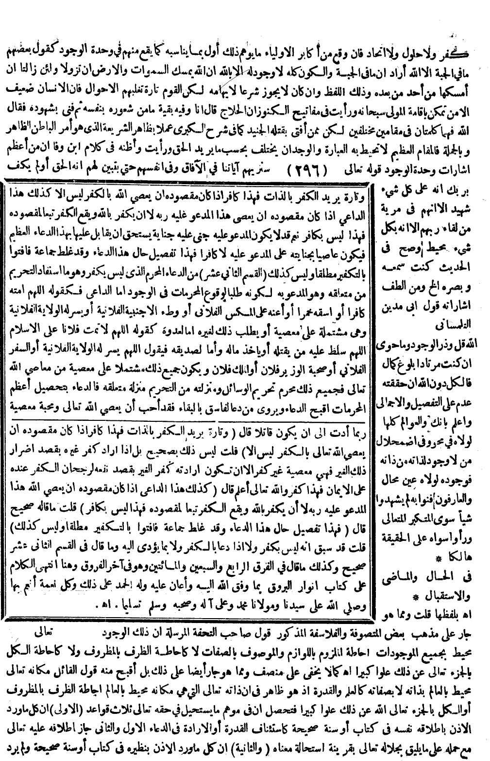 ـــــــــــــــــــــــــــــQكُفْرٌ وَلَا حُلُولَ وَلَا اتِّحَادَ، فَإِنْ وَقَعَ مِنْ أَكَابِرِ الْأَوْلِيَاءِ مَا يُوهِمُ ذَلِكَ أُوِّلَ بِمَا يُنَاسِبُهُ كَمَا يَقَعُ مِنْهُمْ فِي وَحْدَةِ الْوُجُودِ كَقَوْلِ بَعْضِهِمْ مَا فِي الْجُبَّةِ إلَّا اللَّهُ أَرَادَ أَنَّ مَا فِي الْجُبَّةِ وَالْكَوْنِ كُلِّهِ لَا وُجُودَ لَهُ إلَّا بِاَللَّهِ {إِنَّ اللَّهَ يُمْسِكُ السَّمَاوَاتِ وَالأَرْضَ أَنْ تَزُولا وَلَئِنْ زَالَتَا إِنْ أَمْسَكَهُمَا مِنْ أَحَدٍ مِنْ بَعْدِهِ} [فاطر: 41] وَذَلِكَ اللَّفْظُ، وَإِنْ كَانَ لَا يَجُوزُ شَرْعًا لِإِيهَامِهِ لَكِنَّ الْقَوْمَ تَارَةً تَغْلِبُهُمْ الْأَحْوَالُ فَإِنَّ الْإِنْسَانَ ضَعِيفٌ إلَّا مَنْ تَمَكَّنَ بِإِقَامَةِ الْمَوْلَى سُبْحَانَهُ، وَرَأَيْت فِي مَفَاتِيحِ الْكُنُوزِ أَنَّ الْحَلَّاجَ قَالَ أَنَا وَفِيهِ بَقِيَّةٌ مَا مِنْ شُعُورِهِ بِنَفْسِهِ ثُمَّ فَنِيَ بِشُهُودِهِ فَقَالَ اللَّهُ فَهُمَا كَلِمَتَانِ فِي مَقَامَيْنِ مُخْتَلِفَيْنِ لَكِنْ مِمَّنْ أَفْتَى بِقَتْلِهِ الْجُنَيْدُ كَمَا فِي شَرْحِ الْكُبْرَى عَمَلًا بِظَاهِرِ الشَّرِيعَةِ الَّذِي هُوَ أَمْرُ الْبَاطِنِ وَالظَّاهِرِ وَبِالْجُمْلَةِ فَالْمَقَامُ الْعَظِيمُ لَا تُحِيطُ بِهِ الْعِبَارَةُ وَالْوُجْدَانُ يَخْتَلِفَ بِحَسَبِ مَا يُرِيدُ الْحَقُّ وَرَأَيْت وَأَظُنُّهُ فِي كَلَامِ ابْنِ وَفَا أَنَّ مِنْ أَعْظَمِ إشَارَاتِ وَحْدَةِ الْوُجُودِ قَوْله تَعَالَى {سَنُرِيهِمْ آيَاتِنَا فِي الآفَاقِ وَفِي أَنْفُسِهِمْ حَتَّى يَتَبَيَّنَ لَهُمْ أَنَّهُ الْحَقُّ أَوَلَمْ يَكْفِ بِرَبِّكَ أَنَّهُ عَلَى كُلِّ شَيْءٍ شَهِيدٌ} [فصلت: 53] {أَلا إِنَّهُمْ فِي مِرْيَةٍ مِنْ لِقَاءِ رَبِّهِمْ أَلا إِنَّهُ بِكُلِّ شَيْءٍ مُحِيطٌ} [فصلت: 54] وَصَحَّ فِي الْحَدِيثِ كُنْت سَمْعَهُ وَبَصَرَهُ إلَخْ وَمِنْ أَلْطَفِ إشَارَاتِهِ قَوْلُ أَبِي مَدِينٍ التِّلْمِسَانِيِّ