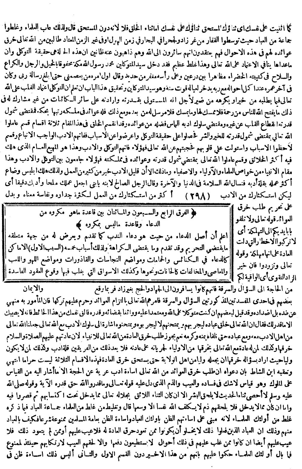 وَتَحْقِيقُ هَذَا الْبَابِ أَنْ تَعْلَمَ أَنَّ التَّوَكُّلَ اعْتِمَادُ الْقَلْبِ عَلَى اللَّهِ تَعَالَى فِيمَا يَطْلُبُهُ مِنْ خَيْرٍ أَوْ يَكْرَهُهُ مِنْ ضَيْرٍ لِأَجْلِ أَنَّهُ الْمُسْتَوْلِي بِقُدْرَتِهِ وَإِرَادَتِهِ عَلَى سَائِرِ الْكَائِنَاتِ مِنْ غَيْرِ مُشَارِكٍ لَهُ فِي ذَلِكَ {مَا يَفْتَحِ اللَّهُ لِلنَّاسِ مِنْ رَحْمَةٍ فَلا مُمْسِكَ لَهَا وَمَا يُمْسِكْ فَلا مُرْسِلَ لَهُ مِنْ بَعْدِهِ} [فاطر: 2] وَمَعَ ذَلِكَ فَلَهُ عَوَائِدُ فِي مُلْكِهِ رَتَّبَهَا بِحِكْمَةٍ، فَمُقْتَضَى شُمُولِ قُدْرَتِهِ انْقِطَاعُ الْقَلْبِ عَنْ غَيْرِهِ وَمُقْتَضَى سُلُوكِ أَدَبِهِ الْتِمَاسُ فَضْلِهِ مِنْ عَوَائِدِهِ، وَقَدْ انْقَسَمَ الْخَلْقُ فِي هَذَا الْمَقَامِ ثَلَاثَةَ أَقْسَامٍ: قِسْمٌ عَامَلُوا اللَّهَ تَعَالَى بِمُقْتَضَى شُمُولِ قُدْرَتِهِ لِلْخَيْرِ وَالشَّرِّ فَحَصَلُوا عَلَى حَقِيقَةِ التَّوَكُّلِ وَأَعْرَضُوا عَنْ الْأَسْبَابِ فَفَاتَهُمْ الْأَدَبُ الْوَاجِبُ الِاتِّبَاعِ وَقِسْمٌ لَاحَظُوا الْأَسْبَابَ وَاسْتَوْلَتْ عَلَى قُلُوبِهِمْ فَحَجَبَتْهُمْ عَنْ اللَّهِ تَعَالَى فَهَؤُلَاءِ فَاتَهُمْ التَّوَكُّلُ وَالْأَدَبُ وَهَذَا هُوَ الْمَهْيَعُ الْعَامُّ الَّذِي هَلَكَ فِيهِ أَكْثَرُ الْخَلَائِقِ، وَقِسْمٌ عَامَلُوا اللَّهَ تَعَالَى بِمُقْتَضَى شُمُولِ قُدْرَتِهِ وَعَوَائِدِهِ فِي مَمْلَكَتِهِ فَهَؤُلَاءِ جَامِعُونَ بَيْنَ التَّوَكُّلِ وَالْأَدَبِ وَهَذَا مَقَامُ الْأَنْبِيَاءِ مِنْ خَوَاصِّ الْعُلَمَاءِ وَالْأَوْلِيَاءِ وَالْأَصْفِيَاءِ وَمَا ذَلِكَ إلَّا أَنَّ قَلِيلَ الْأَدَبِ خَيْرٌ مِنْ كَثِيرٍ مِنْ الْعَمَلِ وَلِذَلِكَ هَلَكَ إبْلِيسُ وَضَاعَ أَكْثَرُ عَمَلِهِ بِقِلَّةِ أَدَبِهِ فَنَسْأَلُ اللَّهَ السَّلَامَةَ فِي الدُّنْيَا وَالْآخِرَةِ.