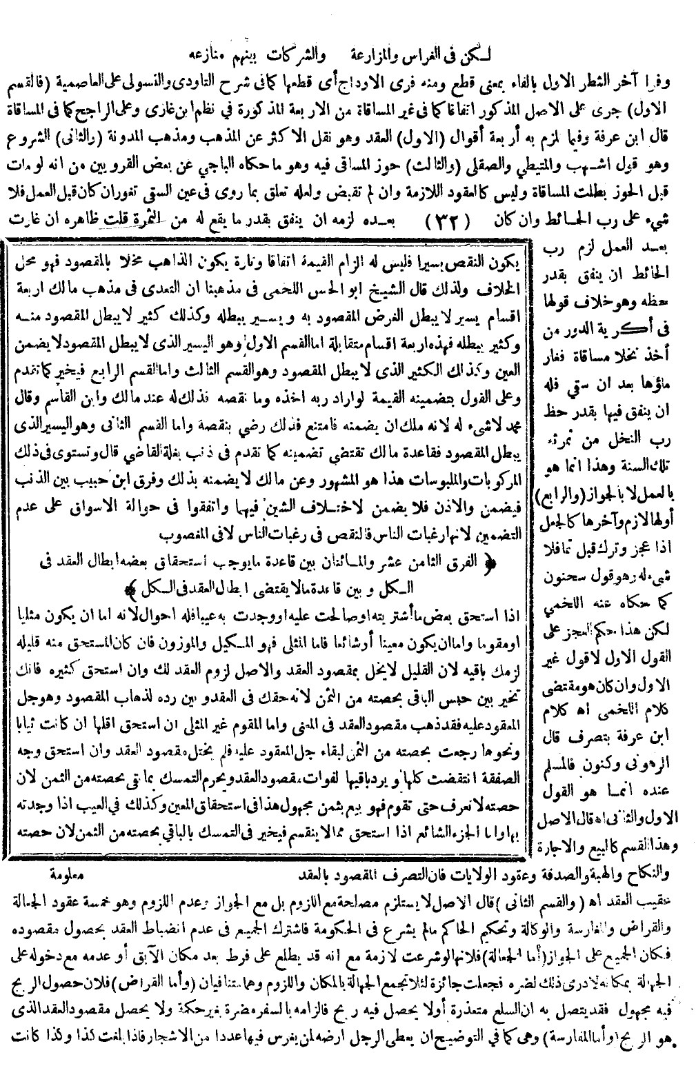 ـــــــــــــــــــــــــــــQوَفَرَا آخِرَ الشَّطْرِ الْأَوَّلِ بِالْفَاءِ بِمَعْنَى قَطَعَ، وَمِنْهُ فَرَى الْأَوْدَاجَ أَيْ قَطَعَهَا كَمَا فِي شَرْحِ التَّاوَدِيِّ وَالتُّسُولِيِّ عَلَى الْعَاصِمِيَّةِ (فَالْقِسْمُ الْأَوَّلُ) جَرَى عَلَى الْأَصْلِ الْمَذْكُورِ اتِّفَاقًا كَمَا فِي غَيْرِ الْمُسَاقَاةِ مِنْ الْأَرْبَعَةِ الْمَذْكُورَةِ فِي نَظْمِ ابْنِ غَازِيٍّ، وَعَلَى الرَّاجِحِ كَمَا فِي الْمُسَاقَاةِ قَالَ ابْنُ عَرَفَةَ وَفِيمَا يَلْزَمُ بِهِ أَرْبَعَةُ أَقْوَالٍ (الْأَوَّلُ) الْعَقْدُ، وَهُوَ نَقْلُ الْأَكْثَرِ عَنْ الْمَذْهَبِ وَمَذْهَبِ الْمُدَوَّنَةِ