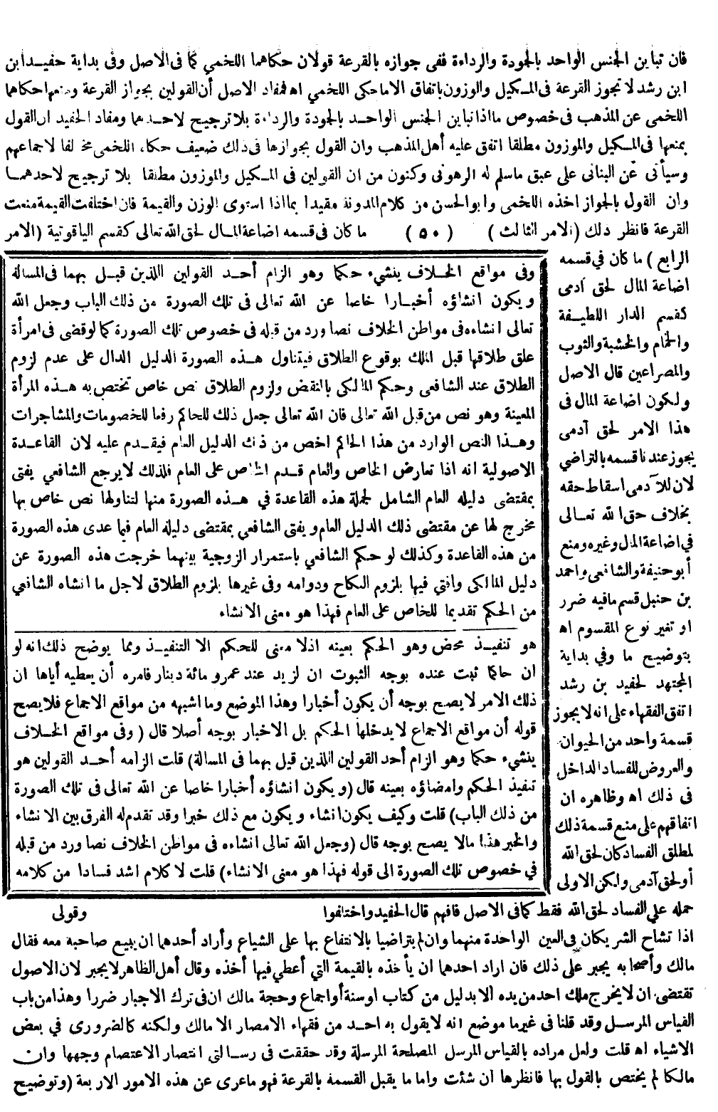 فَمُفَادُ الْأَصْلِ أَنَّ الْقَوْلَيْنِ بِجَوَازِ الْقُرْعَةِ وَمَنْعِهَا حَكَاهُمَا اللَّخْمِيُّ عَنْ الْمَذْهَبِ فِي خُصُوصِ مَا إذَا تَبَايَنَ الْجِنْسُ الْوَاحِدُ بِالْجَوْدَةِ وَالرَّدَاءَةِ بِلَا تَرْجِيحٍ لِأَحَدِهِمَا، وَمَفَادُ الْحَفِيدِ أَنَّ الْقَوْلَ بِمَنْعِهَا فِي الْمَكِيلِ وَالْمَوْزُونِ مُطْلَقًا اتَّفَقَ عَلَيْهِ أَهْلُ الْمَذْهَبِ، وَأَنَّ الْقَوْلَ بِجَوَازِهَا فِي ذَلِكَ ضَعِيفٌ حَكَاهُ اللَّخْمِيُّ مُخَالِفًا لِإِجْمَاعِهِمْ، وَسَيَأْتِي عَنْ الْبُنَانِيِّ عَلَى عبق مَا سَلَّمَ لَهُ الرَّهُونِيُّ وَكَنُونِ مِنْ أَنَّ الْقَوْلَيْنِ فِي الْمَكِيلِ وَالْمَوْزُونِ مُطْلَقًا بِلَا تَرْجِيحٍ لِأَحَدِهِمَا، وَأَنَّ الْقَوْلَ بِالْجَوَازِ أَخَذَهُ اللَّخْمِيُّ وَأَبُو الْحَسَنِ مِنْ كَلَامِ الْمُدَوَّنَةِ مُقَيَّدًا بِمَا إذَا اسْتَوَى الْوَزْنُ وَالْقِيمَةُ فَإِنْ اخْتَلَفَتْ الْقِيمَةُ مُنِعَتْ الْقُرْعَةُ فَانْظُرْ ذَلِكَ (الْأَمْرُ الثَّالِثُ) مَا كَانَ فِي قَسْمِهِ إضَاعَةُ الْمَالِ لِحَقِّ اللَّهِ تَعَالَى كَقَسْمِ الْيَاقُوتِيَّةِ (الْأَمْرُ الرَّابِعُ) مَا كَانَ فِي قَسْمِهِ إضَاعَةُ الْمَالِ لِحَقٍّ آدَمِيٍّ كَقَسْمِ الدَّارِ اللَّطِيفَةِ وَالْحَمَّامِ وَالْخَشَبَةِ وَالثَّوْبِ وَالْمِصْرَاعَيْنِ قَالَ الْأَصْلُ: وَلِكَوْنِ إضَاعَةِ الْمَالِ فِي هَذَا الْأَمْرِ لِحَقٍّ آدَمِيٍّ يَجُوزُ عِنْدَنَا قَسْمُهُ بِالتَّرَاضِي لِأَنَّ لِلْآدَمِيِّ إسْقَاطُ حَقِّهِ بِخِلَافِ حَقِّ اللَّهِ تَعَالَى فِي إضَاعَةِ الْمَالِ وَغَيْرِهِ وَمَنَعَ أَبُو حَنِيفَةَ وَالشَّافِعِيُّ وَأَحْمَدُ بْنُ حَنْبَلٍ قَسْمَ مَا فِيهِ ضَرَرٌ أَوْ تَغَيُّرُ نَوْعِ الْمَقْسُومِ اهـ.
