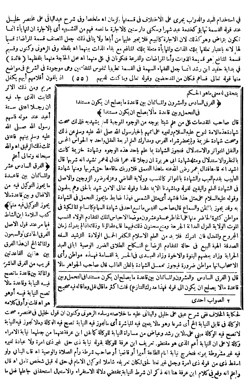 وَقَاعِدَةُ مَا لَا تَصِحُّ النِّيَابَةُ فِيهِ أَوْ هُوَ هُوَ اهـ قُلْت، وَأَوْفَى كَلَامُهُ لِحِكَايَةِ الْخِلَافِ فَفِي شَرْحِ عبق عَلَى خَلِيلٍ وَالْبَنَّانِيِّ عَلَيْهِ مَا خُلَاصَتُهُ وَسَلَّمَهُ الرَّهُونِيُّ وَكَنُونِ أَنَّ قَوْلَ خَلِيلٍ فِي مُخْتَصَرِهِ صَحَّتْ الْوَكَالَةُ فِي قَابِلِ النِّيَابَةِ إلَخْ أَيْ شَرْعًا، وَهُوَ مَا لَا يَتَعَيَّنُ فِيهِ الْمُبَاشَرَةُ أَيْ مَا تَجُوزُ فِيهِ النِّيَابَةُ تَصِحُّ فِيهِ الْوَكَالَةُ، وَمَا لَا تَجُوزُ فِيهِ النِّيَابَةُ لَا تَصِحُّ فِيهِ الْوَكَالَةُ مَبْنِيٌّ عَلَى مَا لِابْنِ رُشْدٍ وَعِيَاضٍ مِنْ مُسَاوَاةِ النِّيَابَةِ لِلْوَكَالَةِ كَمَا نَقَلَ ابْنُ عَرَفَةَ عَنْهُمَا مِنْ جَعْلِهِمَا نِيَابَةَ الْأُمَرَاءِ وَكَالَةً لَا عَلَى أَنَّ النِّيَابَةَ أَعَمُّ الَّذِي هُوَ مُقْتَضَى تَعْرِيفِ ابْنِ عَرَفَةَ لِلْوَكَالَةِ بِقَوْلِهِ نِيَابَةُ ذِي حَقٍّ غَيْرِ ذِي إمْرَةٍ، وَلَا عِبَادَةٍ لِغَيْرِهِ فِيهِ غَيْرُ مَشْرُوطَةٍ بِمَوْتِهِ فَتَخْرُجُ نِيَابَةُ إمَامِ الطَّاعَةِ أَمِيرًا أَوْ قَاضِيًا أَوْ صَاحِبَ شُرْطَةٍ، أَوْ إمَامَ الصَّلَاةِ وَالْوَصِيَّ اهـ.