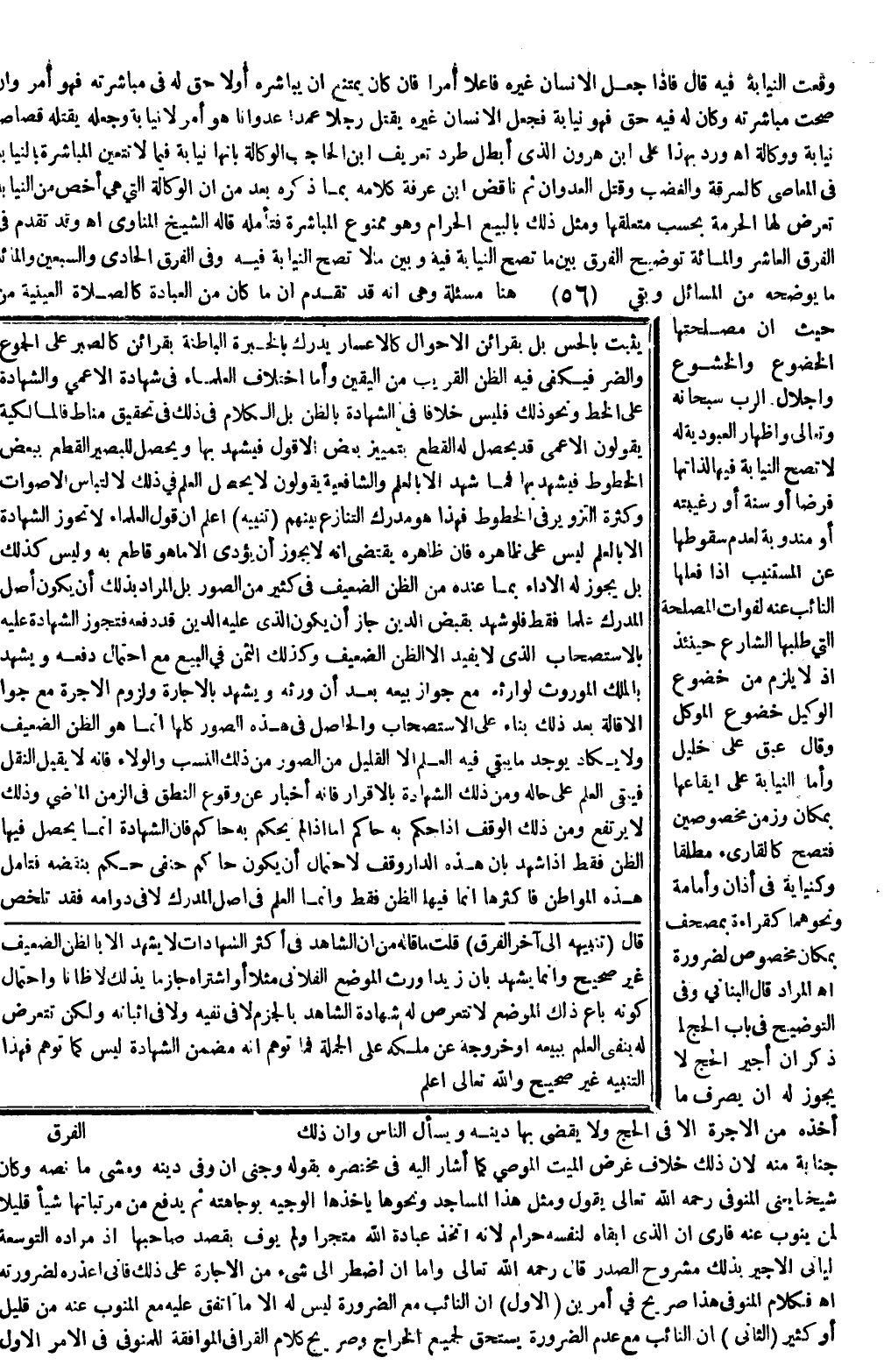 وَقَدْ تَقَدَّمَ فِي الْفَرْقِ الْعَاشِرِ وَالْمِائَةِ تَوْضِيحُ الْفَرْقِ بَيْنَ مَا تَصِحُّ النِّيَابَةُ فِيهِ وَبَيْنَ مَا لَا تَصِحُّ النِّيَابَةُ فِيهِ، وَفِي الْفَرْقِ الْحَادِي وَالسَّبْعِينَ وَالْمِائَةِ مَا يُوَضِّحُهُ مِنْ الْمَسَائِلِ، وَبَقِيَ هُنَا مَسْأَلَةٌ، وَهِيَ أَنَّهُ قَدْ تَقَدَّمَ أَنَّ مَا كَانَ مِنْ الْعِبَادَةِ كَالصَّلَاةِ الْعَيْنِيَّةِ مِنْ حَيْثُ إنَّ مَصْلَحَتَهَا الْخُضُوعُ، وَالْخُشُوعُ، وَإِجْلَالُ الرَّبِّ سُبْحَانَهُ وَتَعَالَى، وَإِظْهَارُ الْعُبُودِيَّةِ لَهُ لَا تَصِحُّ النِّيَابَةُ فِيهَا لِذَاتِهَا فَرْضًا أَوْ سُنَّةً أَوْ رَغِيبَةً أَوْ مَنْدُوبَةً لِعَدَمِ سُقُوطِهَا عَنْ الْمُسْتَنِيبِ إذَا فَعَلَهَا النَّائِبُ عَنْهُ لِفَوَاتِ الْمَصْلَحَةِ الَّتِي طَلَبَهَا الشَّارِعُ حِينَئِذٍ إذْ لَا يَلْزَمُ مِنْ خُضُوعِ الْوَكِيلِ خُضُوعُ الْمُوَكِّلِ، وَقَالَ عبق عَلَى خَلِيلٍ، وَأَمَّا النِّيَابَةُ عَلَى إيقَاعِهَا بِمَكَانٍ وَزَمَنٍ مَخْصُوصَيْنِ فَتَصِحُّ كَالْقَارِئِ مُطْلَقًا، وَكَنِيَابَةٍ فِي أَذَانٍ وَإِمَامَةٍ، وَنَحْوِهِمَا كَقِرَاءَةٍ بِمُصْحَفٍ بِمَكَانٍ مَخْصُوصٍ لِضَرُورَةٍ اهـ.