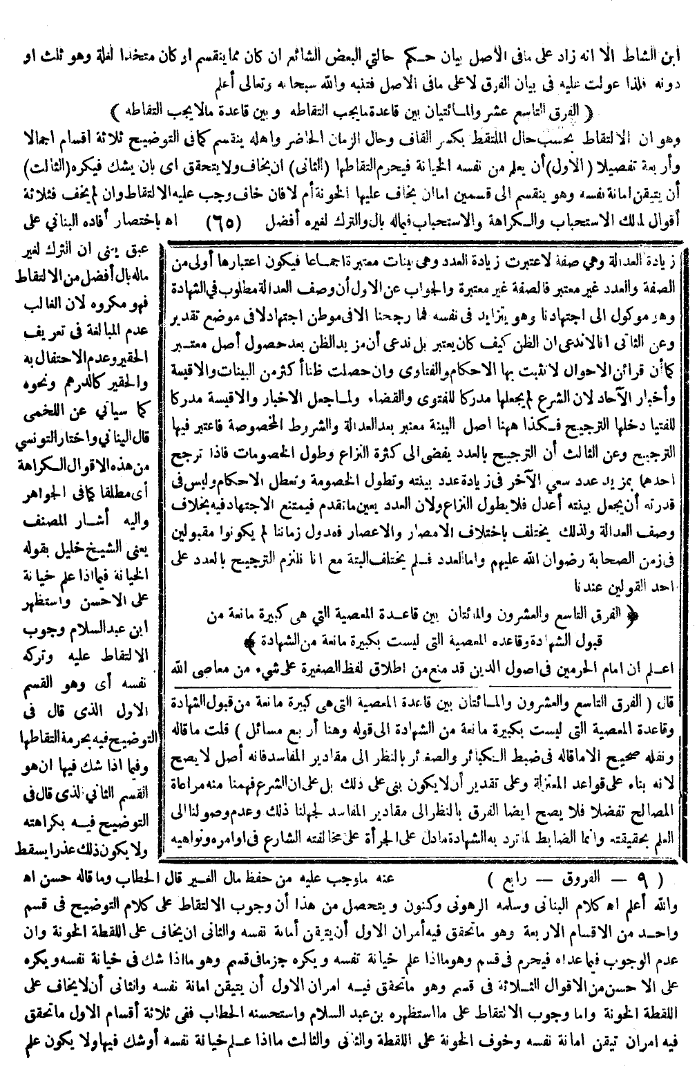 كَلَامُ الْبُنَانِيِّ، وَسَلَّمَهُ الرَّهُونِيُّ وَكَنُونِ، وَيَتَحَصَّلُ مِنْ هَذَا أَنَّ وُجُوبَ الِالْتِقَاطِ عَلَى كَلَامِ التَّوْضِيحِ فِي قِسْمٍ وَاحِدٍ مِنْ الْأَقْسَامِ الْأَرْبَعَةِ، وَهُوَ مَا تَحَقَّقَ فِيهِ أَمْرَانِ الْأَوَّلُ أَنْ يَتَيَقَّنَ أَمَانَةَ نَفْسِهِ، وَالثَّانِي أَنْ يَخَافَ عَلَى اللُّقَطَةِ الْخَوَنَةَ، وَأَنَّ عَدَمَ الْوُجُوبِ فِيمَا عَدَاهُ فَيَحْرُمُ فِي قِسْمٍ، وَهُوَ مَا إذَا عَلِمَ خِيَانَةَ نَفْسِهِ، وَيُكْرَهُ جَزْمًا فِي قِسْمٍ، وَهُوَ مَا إذَا شَكَّ فِي خِيَانَةِ نَفْسِهِ، وَيُكْرَهُ عَلَى الْأَحْسَنِ مِنْ الْأَقْوَالِ الثَّلَاثَةِ فِي قِسْمٍ، وَهُوَ مَا تَحَقَّقَ فِيهِ أَمْرَانِ الْأَوَّلُ أَنْ يَتَيَقَّنَ أَمَانَةَ نَفْسِهِ، وَالثَّانِي أَنْ لَا يَخَافَ عَلَى اللُّقَطَةِ الْخَوَنَةَ.