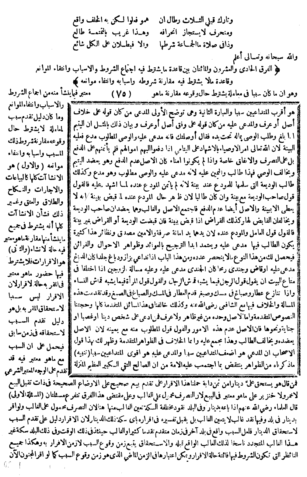 وَهُوَ أَنَّ مَا كَانَ سَبَبًا فِي مُعَامَلَةٍ يُشْتَرَطُ حَالَ وُقُوعِهِ مُقَارَنَةُ مَا هُوَ مُعْتَبَرٌ فِيمَا يَنْشَأُ مِنْهُ مِنْ اجْتِمَاعِ الشُّرُوطِ وَالْأَسْبَابِ وَانْتِفَاءِ الْمَوَانِعِ، وَمَا كَانَ دَلِيلُ تَقَدُّمِ سَبَبٍ لِمُعَامَلَةٍ لَا يُشْتَرَطُ حَالَ وُقُوعِهِ مُقَارَنَةُ شُرُوطِ ذَلِكَ الْمُسَبِّبِ وَأَسْبَابِهِ وَانْتِفَاءُ مَوَانِعِهِ (وَالْأَوَّلُ) هُوَ الْإِنْشَاءَاتُ كُلُّهَا كَالْبِيَاعَاتِ وَالْإِجَارَاتِ وَالنِّكَاحِ وَالطَّلَاقِ وَالْعِتْقِ، وَغَيْرِ ذَلِكَ فَشَأْنُ الْإِنْشَاءَاتِ كُلِّهَا أَنَّهُ يُشْتَرَطُ فِي جَمِيعِ مَا يَنْشَأُ مِنْهَا مُقَارَنَةُ مَا هُوَ مُعْتَبَرٌ فِيهِ حَالَةَ الْإِنْشَاءِ.