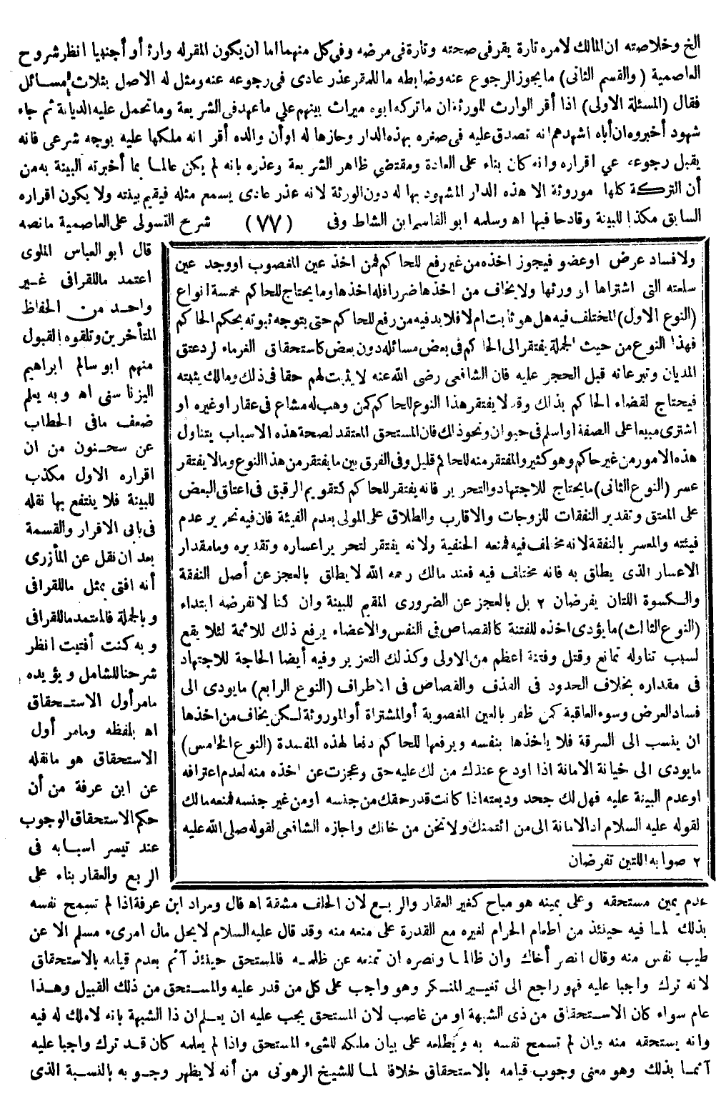 وَسَلَّمَهُ أَبُو الْقَاسِمِ بْنِ الشَّاطِّ، وَفِي شَرْحِ التَّسَوُّلِيِّ عَلَى الْعَاصِمِيَّةِ مَا نَصُّهُ قَالَ أَبُو الْعَبَّاسِ الْمَلَوِيُّ اعْتَمَدَ مَا لِلْقَرَافِيِّ غَيْرُ وَاحِدٍ مِنْ الْحُفَّاظِ الْمُتَأَخِّرِينَ، وَتَلَقَّوْهُ بِالْقَبُولِ مِنْهُمْ أَبُو سَالِمٍ إبْرَاهِيمُ الْيَزَنَاسَنِيُّ اهـ.