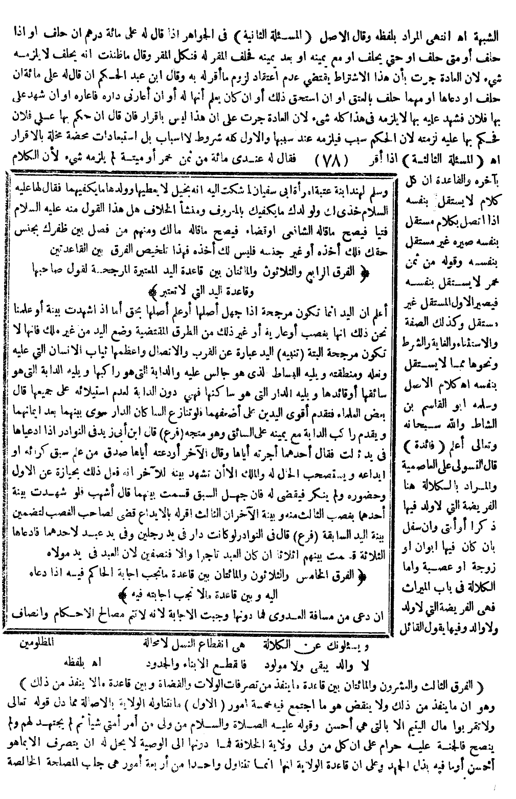 (فَائِدَةٌ) قَالَ التَّسَوُّلِيُّ عَلَى الْعَاصِمِيَّةِ، وَالْمُرَادُ بِالْكَلَالَةِ هُنَا الْفَرِيضَةُ الَّتِي لَا، وَلَدَ فِيهَا ذَكَرًا أَوْ أُنْثَى، وَإِنْ سَفَلَ بِأَنْ كَانَ فِيهَا أَبَوَانِ أَوْ زَوْجَةٌ أَوْ عُصْبَةٌ، وَأَمَّا الْكَلَالَةُ فِي بَابِ الْمِيرَاثِ فَهِيَ الْفَرِيضَةُ الَّتِي لَا وَلَدَ وَلَا وَالِدَ، وَفِيهَا يَقُولُ الْقَائِلُ: