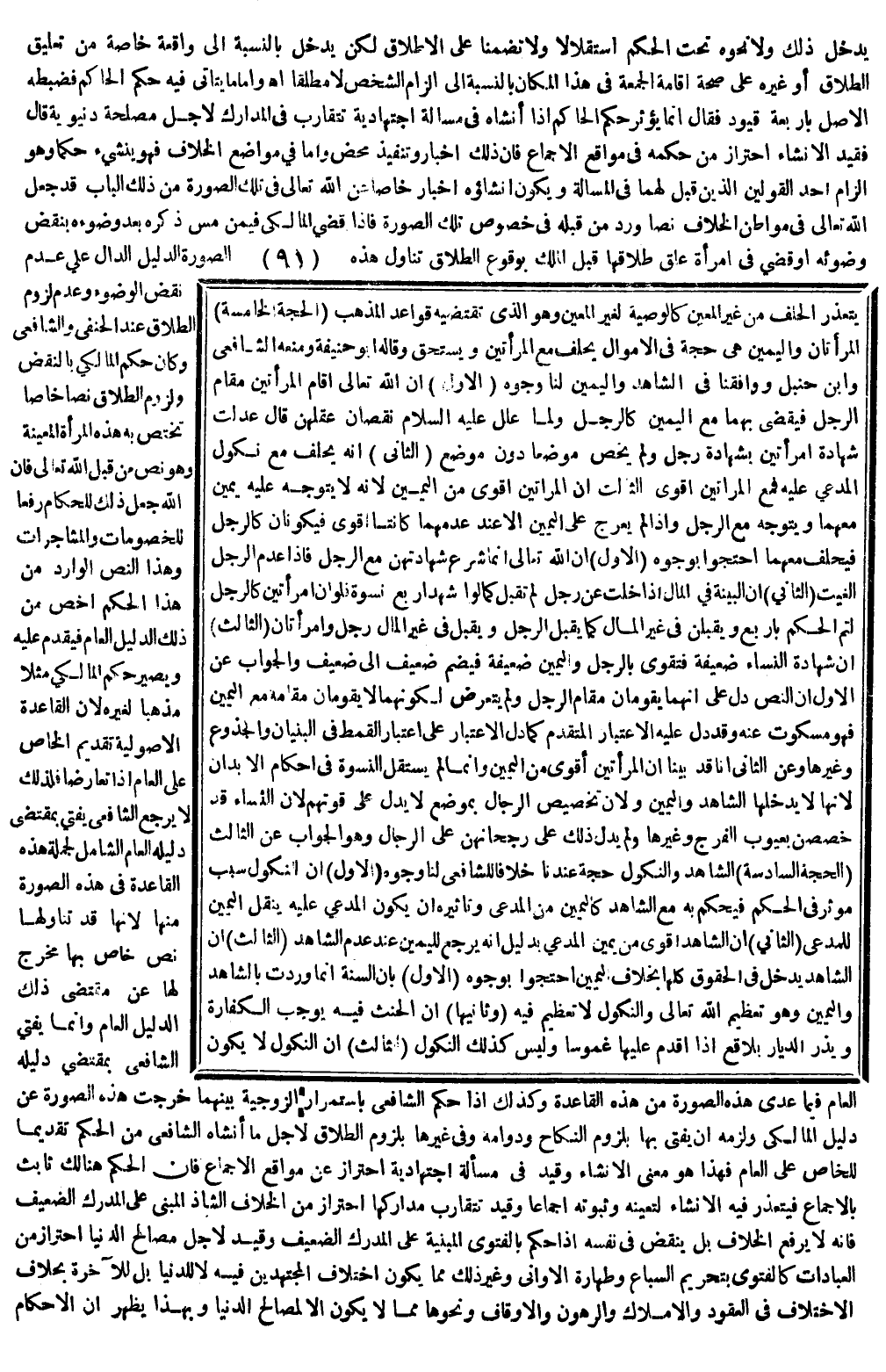 وَأَمَّا مَا يَتَأَتَّى فِيهِ حُكْمُ الْحَاكِمِ فَضَبَطَهُ الْأَصْلُ بِأَرْبَعَةِ قُيُودٍ فَقَالَ إنَّمَا يُؤَثِّرُ حُكْمُ الْحَاكِمِ إذَا أَنْشَأَهُ فِي مَسْأَلَةٍ اجْتِهَادِيَّةٍ تَتَقَارَبُ فِي الْمَدَارِكِ لِأَجْلِ مَصْلَحَةٍ دُنْيَوِيَّةٍ قَالَ فَقَيْدُ الْإِنْشَاءِ احْتِرَازٌ مِنْ حُكْمِهِ فِي مَوَاقِعِ الْإِجْمَاعِ فَإِنَّ ذَلِكَ إخْبَارٌ وَتَنْفِيذٌ مَحْضٌ، وَأَمَّا فِي مَوَاضِعِ الْخِلَافِ فَهُوَ يُنْشِئُ حُكْمًا، وَهُوَ إلْزَامُ أَحَدِ الْقَوْلَيْنِ اللَّذَيْنِ قِيلَ بِهِمَا فِي الْمَسْأَلَةِ، وَيَكُونُ إنْشَاؤُهُ إخْبَارًا خَاصًّا عَنْ اللَّهِ تَعَالَى فِي تِلْكَ الصُّورَةِ مِنْ ذَلِكَ الْبَابِ قَدْ جَعَلَ اللَّهُ تَعَالَى فِي مَوَاطِنِ الْخِلَافِ نَصًّا وَرَدَ مِنْ قِبَلِهِ فِي خُصُوصِ تِلْكَ الصُّورَةِ فَإِذَا قَضَى الْمَالِكِيُّ فِيمَنْ مَسَّ ذَكَرَهُ بَعْدَ وُضُوءُهُ بِنَقْضِ وُضُوئِهِ أَوْ قَضَى فِي امْرَأَةٍ عُلِّقَ طَلَاقُهَا قَبْلَ الْمِلْكِ بِوُقُوعِ الطَّلَاقِ تَنَاوَلَ هَذِهِ الصُّورَةَ الدَّلِيلُ الدَّالُّ عَلَى عَدَمِ نَقْضِ الْوُضُوءِ وَعَدَمِ لُزُومِ الطَّلَاقِ عِنْدَ الْحَنَفِيِّ وَالشَّافِعِيِّ، وَكَانَ حُكْمُ الْمَالِكِيِّ بِالنَّقْضِ وَلُزُومِ الطَّلَاقِ نَصًّا خَاصًّا تَخْتَصُّ بِهِ هَذِهِ الْمَرْأَةُ الْمُعَيَّنَةُ، وَهُوَ نَصٌّ مِنْ قِبَلِ اللَّهِ تَعَالَى فَإِنَّ اللَّهَ جَعَلَ ذَلِكَ لِلْحُكَّامِ رَفْعًا لِلْخُصُومَاتِ وَالْمُشَاجَرَاتِ، وَهَذَا النَّصُّ الْوَارِدُ مِنْ هَذَا الْحُكْمِ أَخَصُّ مِنْ ذَلِكَ الدَّلِيلِ الْعَامِّ فَيُقَدَّمُ عَلَيْهِ، وَيَصِيرُ حُكْمُ الْمَالِكِيِّ مَثَلًا مَذْهَبًا لِغَيْرِهِ لِأَنَّ الْقَاعِدَةَ الْأُصُولِيَّةَ تَقْدِيمُ الْخَاصِّ عَلَى الْعَامِّ إذَا تَعَارَضَا فَلِذَلِكَ لَا يَرْجِعُ الشَّافِعِيُّ يُفْتِي بِمُقْتَضَى دَلِيلِهِ الْعَامِّ الشَّامِلِ لِجُمْلَةِ هَذِهِ الْقَاعِدَةِ فِي هَذِهِ الصُّورَةِ مِنْهَا لِأَنَّهَا قَدْ تَنَاوَلَهَا نَصٌّ خَاصٌّ بِهَا مُخْرِجٌ لَهَا عَنْ مُقْتَضَى ذَلِكَ الدَّلِيلِ الْعَامِّ، وَإِنَّمَا يُفْتِي الشَّافِعِيُّ بِمُقْتَضَى دَلِيلِهِ الْعَامِّ فِيمَا عَدَا هَذِهِ الصُّورَةِ مِنْ هَذِهِ الْقَاعِدَةِ.