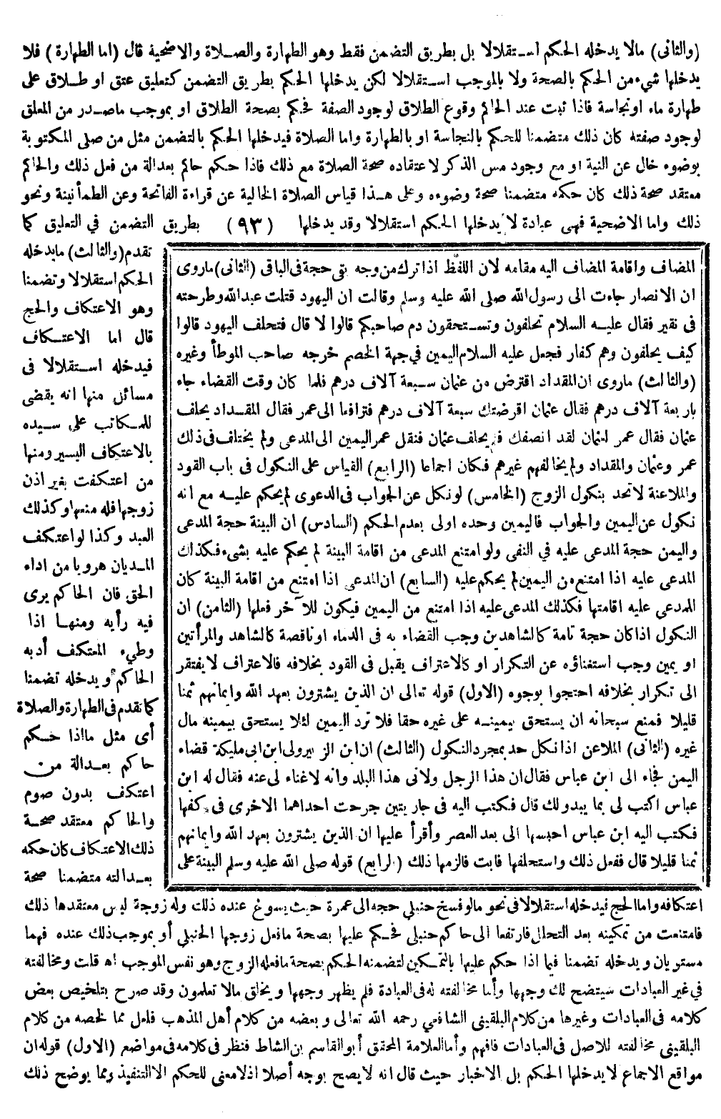 وَأَمَّا الصَّلَاةُ فَيَدْخُلُهَا الْحُكْمُ بِالتَّضَمُّنِ مِثْلُ مَنْ صَلَّى الْمَكْتُوبَةَ بِوُضُوءٍ خَالٍ عَنْ النِّيَّةِ أَوْ مَعَ وُجُودِ مَسِّ الذَّكَرِ لِاعْتِقَادِهِ صِحَّةَ الصَّلَاةِ مَعَ ذَلِكَ فَإِذَا حَكَمَ حَاكِمٌ بِعَدَالَةِ مَنْ فَعَلَ ذَلِكَ، وَالْحَاكِمُ مُعْتَقِدٌ صِحَّةَ ذَلِكَ كَانَ حُكْمُهُ مُتَضَمِّنًا صِحَّةَ وُضُوءُهُ، وَعَلَى هَذَا قِيَاسُ الصَّلَاةِ الْخَالِيَةِ عَنْ قِرَاءَةِ الْفَاتِحَةِ، وَعَنْ الطُّمَأْنِينَةِ، وَنَحْوِ ذَلِكَ، وَأَمَّا الْأُضْحِيَّةُ فَهِيَ عِبَادَةٌ لَا يَدْخُلُهَا الْحُكْمُ اسْتِقْلَالًا، وَقَدْ يَدْخُلُهَا بِطَرِيقِ التَّضَمُّنِ فِي التَّعْلِيقِ كَمَا تَقَدَّمَ.
