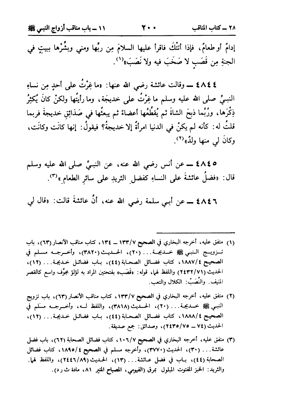 (¬3) متفق عليه، أخرجه البخاري في الصحيح 7/ 106، كتاب فضائل الصحابة (62)، باب فضل عائشة. . . (30)، الحديث (3770)، وأخرجه مسلم في الصحيح 14/ 895، كتاب فضائل الصحابة (44)، باب في فضل عائشة. . . (13)، الحديث (89/ 2446)، واللفظ لهما. والثريد: الخبز المفتوت المبلول بمرق (الفيومي)، المصباح المنير 81، مادة ث ر د).