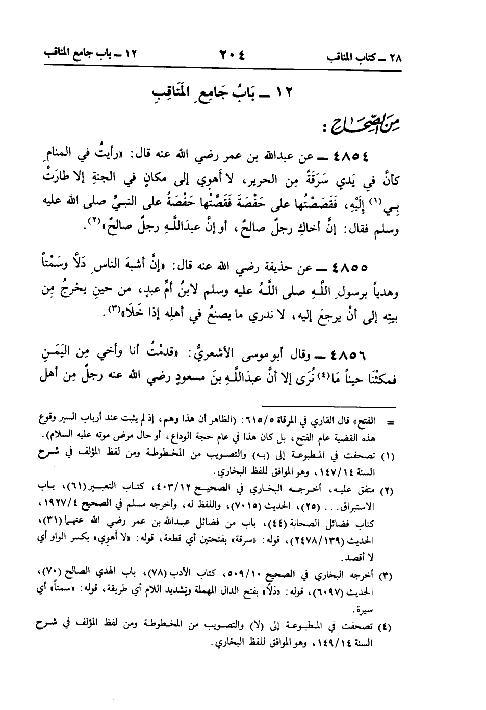 4854 - عن عبد اللَّه بن عمر رضي اللَّه عنه قال: "رأيتُ في المنامِ كأنَّ في يَدي سَرَقَةً مِن الحرير، لا أَهوِي إلى مكانٍ في الجنَّةِ إلّا طارَتْ بِي (¬1) إِلَيْهِ، فَقَصَصْتُها على حَفْصَةَ فَقَصَّتْها حَفْصَةُ على النبيِّ صلى اللَّه عليه وسلم فقال: إنَّ أخاكِ رجلٌ صالحٌ، أو إنَّ عبدَ اللَّهِ رجلٌ صالحٌ" (¬2).