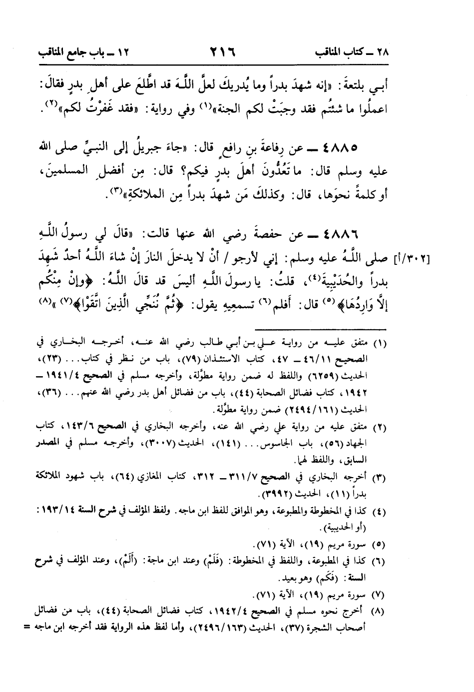 4885 - عن رِفاعةَ بنِ رافعٍ قال: "جاءَ جبريلُ إلى النَّبيِّ صلى اللَّه عليه وسلم قال: ما تَعُدُّاونَ أهلَ بدرٍ فيكم؟ قال: مِن أفضلِ المسلمينَ، أو كلمةً نحوَها، قال: وكذلكَ مَن شهدَ بدرًا مِن الملائكةِ" (¬3).