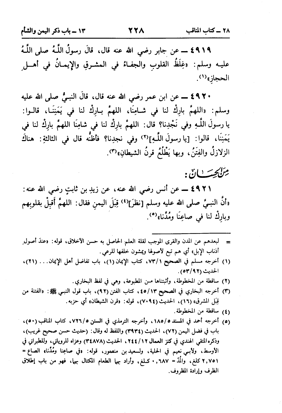 (¬5) أخرجه أحمد في المسند 5/ 185، وأخرجه الترمذي في السنن 5/ 726، كتاب المناقب (50)، باب في فضل اليمن (72)، الحديث (3934) واللفظ له وقال: (حديث حسن صحيح غريب)، وذكره المتقي الهندي في كنز العمال 12/ 244، الحديث (34878) وعزاه للروياني، وللطبراني في الأوسط، ولأبي نعيم في الحلية، ولسعيد بن منصور، قوله: "في صاعِنا ومُدِّنا" الصاع= 2.751 كلغ، والمُدّ = 0.687 كلغ، وأراد بهما الطعام المكتال بهما، فهو من باب إطلاق الظرف وإرادة المظروف.