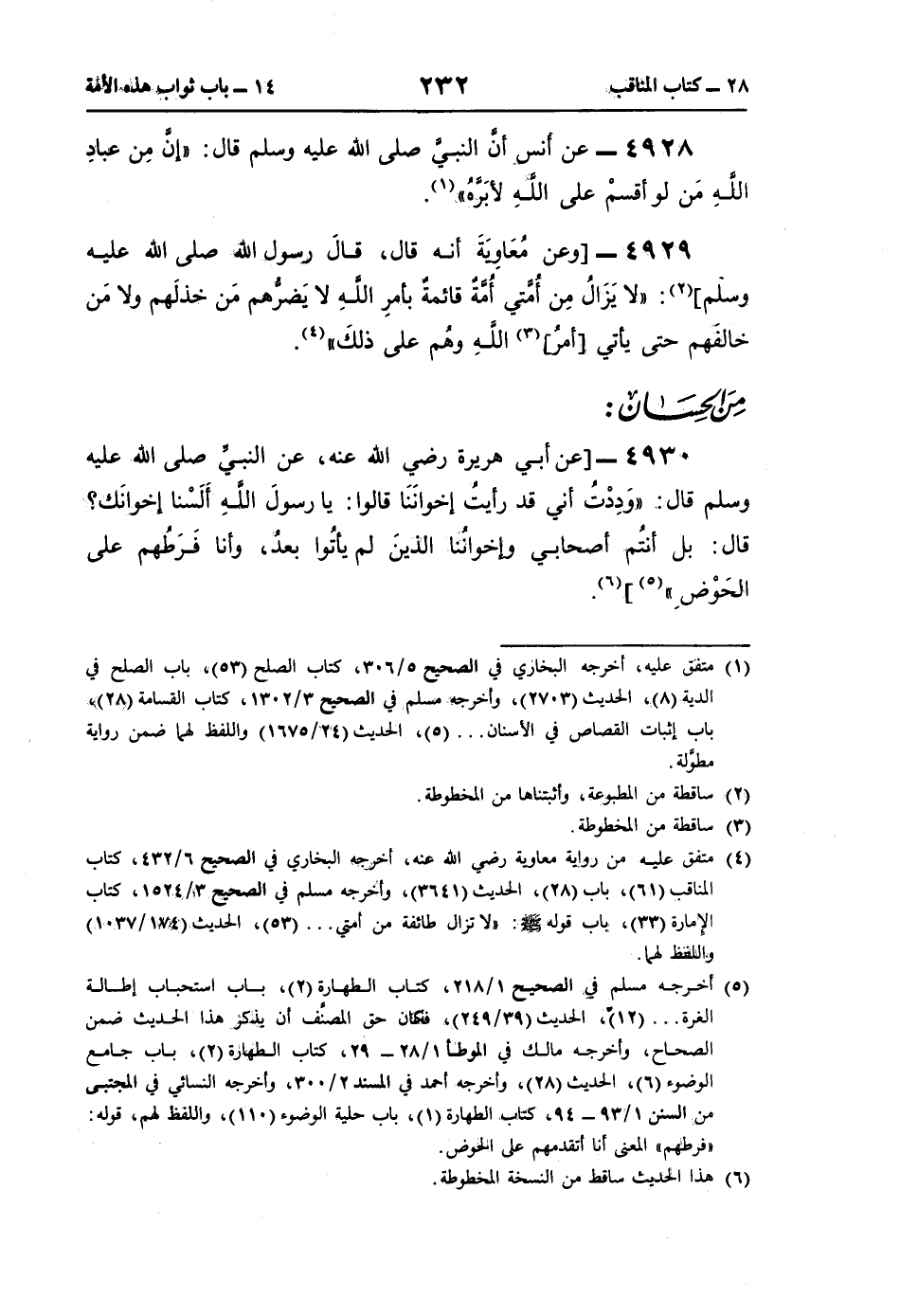 4929 - [وعن مُعَاويَةَ أنَّه قال، قالَ رسول اللَّه صلى اللَّه عليه وسلَّم] (¬2): "لا يَزَالُ مِن أُمَّتي أُمَّة قائمةٌ بأمرِ اللَّهِ لا يَضرُّهم مَن خذلَهم ولا مَن خالفَهم حتَّى يأتي [أمرُ] (¬3) اللَّهِ وهُم على ذلكَ" (¬4).