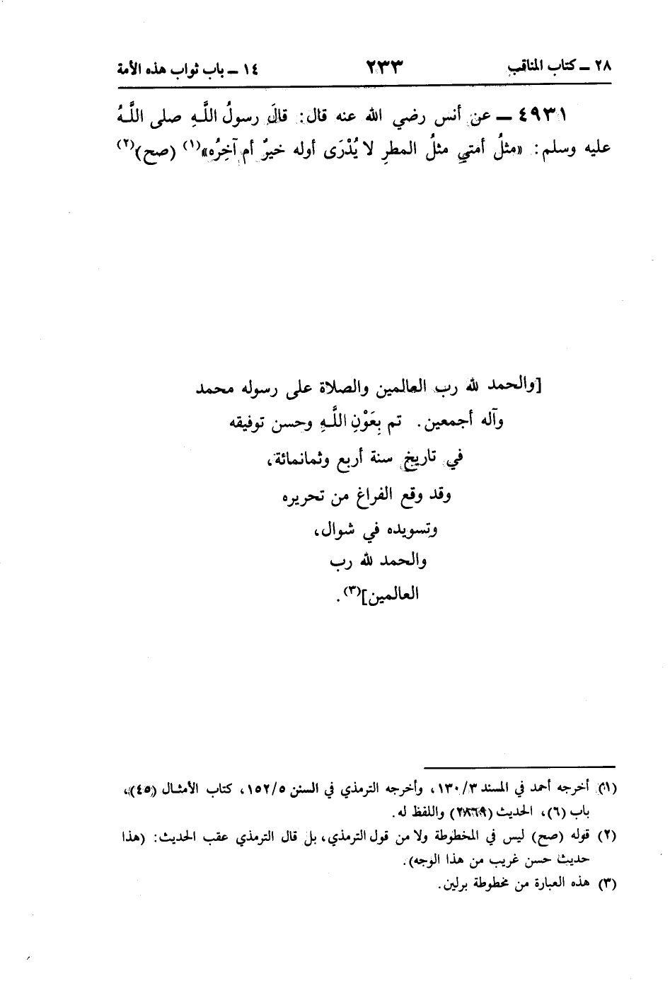 [والحمد للَّه رب العالمين والصلاة على رسوله محمد وآله أجمعين. تم بِعَوْنِ اللَّهِ وحسن توفيقه في تاريخ سنة أربع وثمانمائة، وقد وقع الفراغ من تحريره وتسويده في شوال، والحمد للَّه رب العالمين] (¬3).
