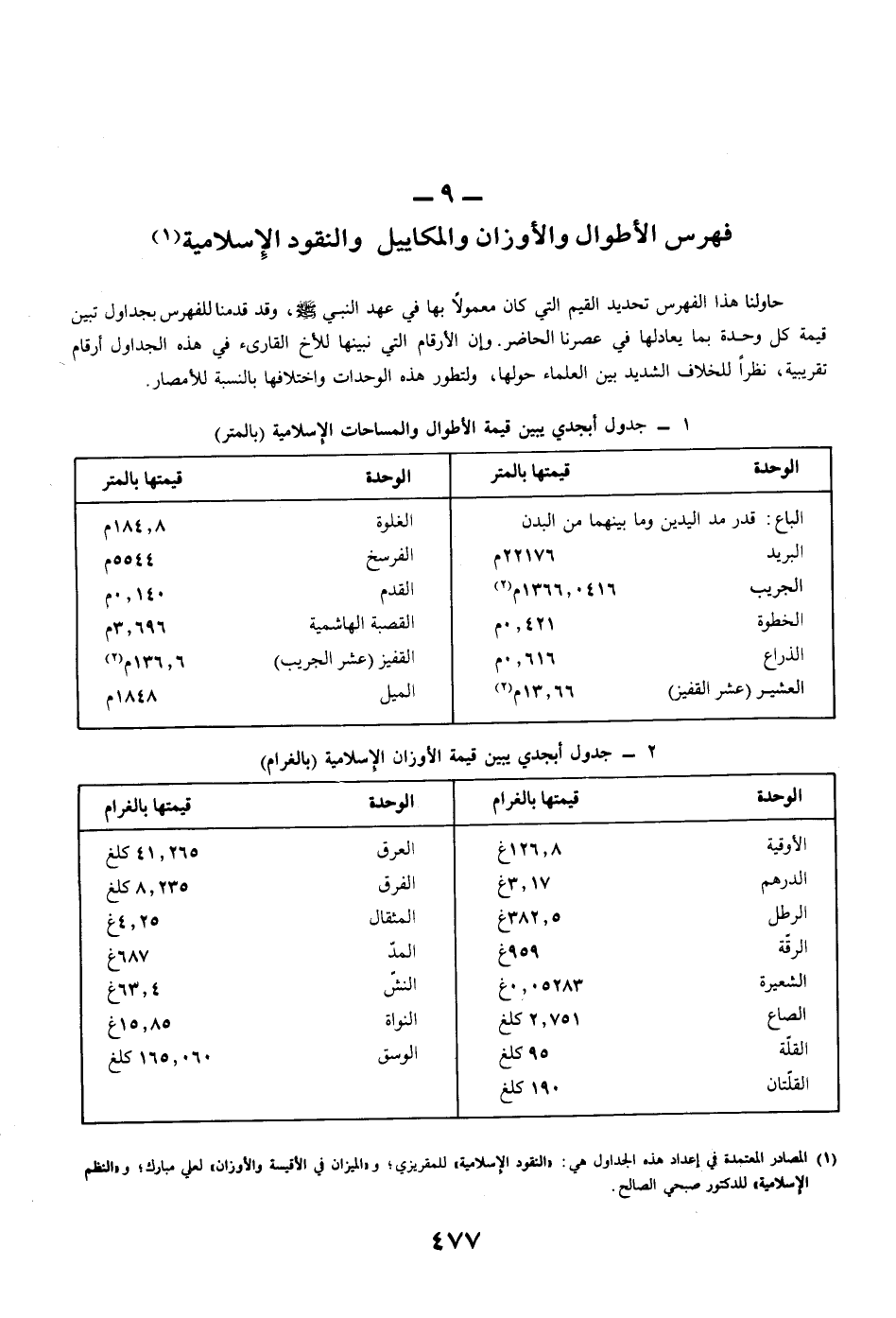 فهرس الأطوال والأوزان والمكاييل والنقود الإِسلامية (¬1)
