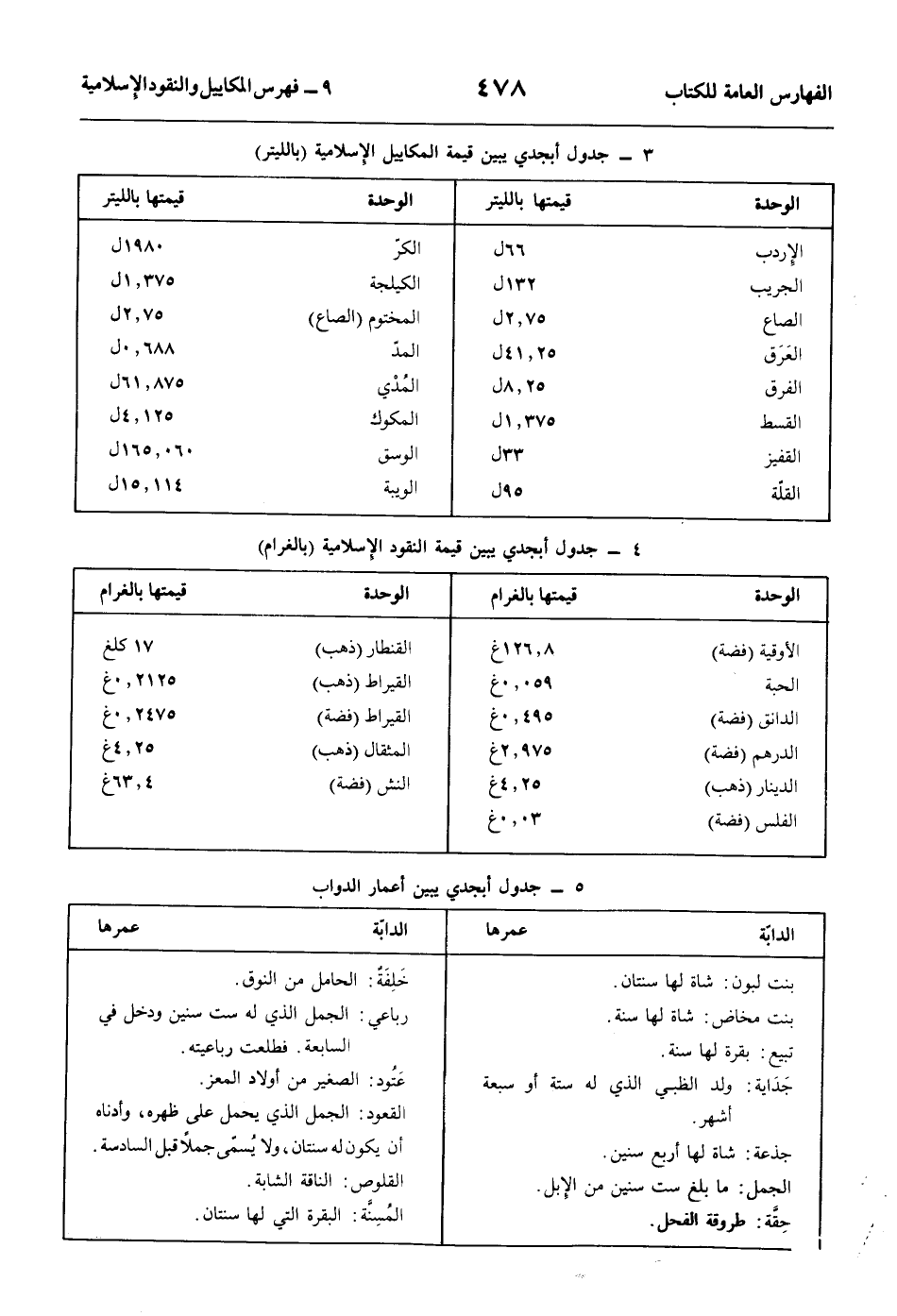 3 - جدول أبجدي يبين قيمة المكاييل الإسلامية (بالليتر)