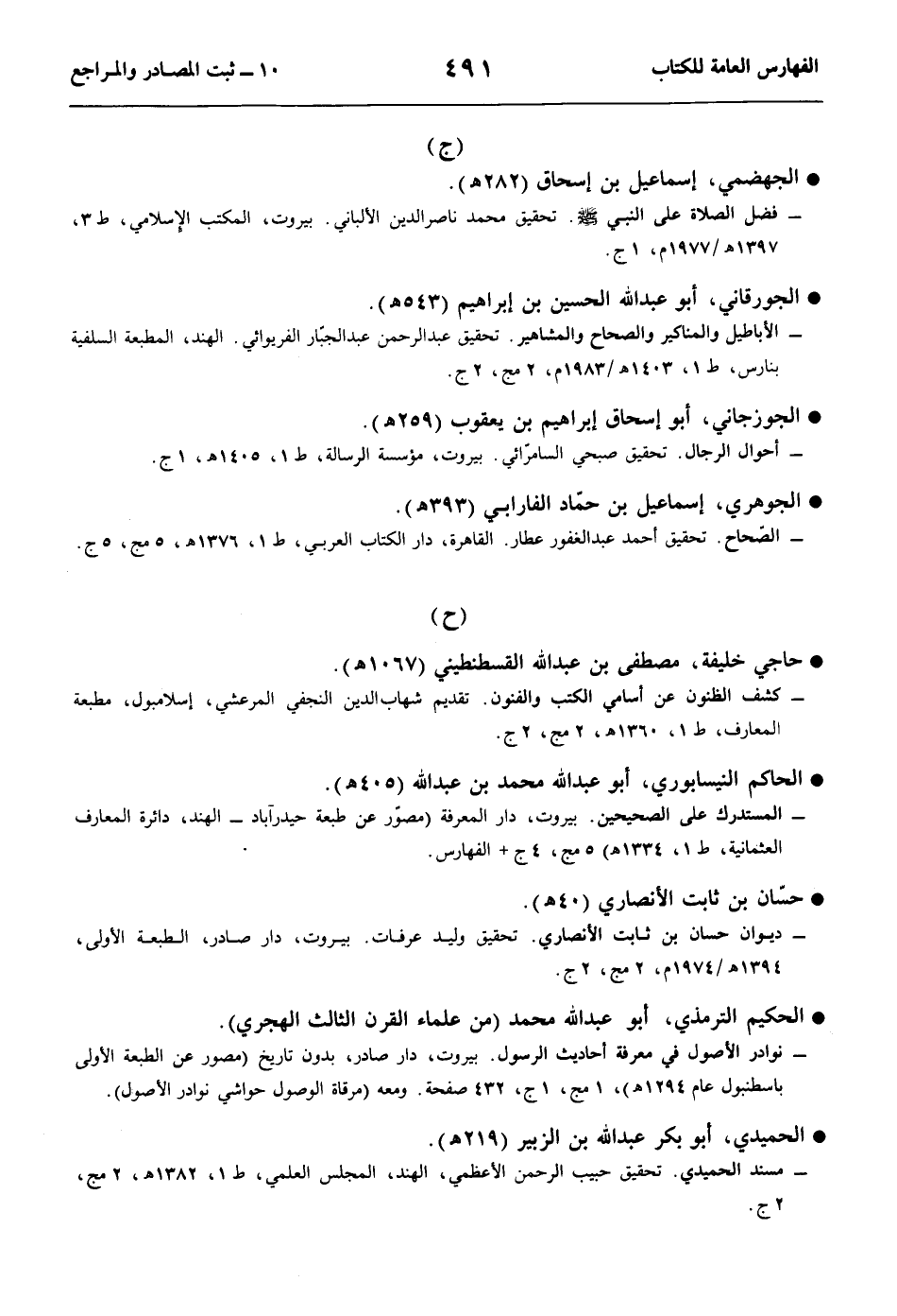 - كشف الظنون عن أسامي الكتب والفنون. تقديم شهاب الدين النجفي المرعشي، إسلامبول، مطبعة المعارف، ط 1، 1360 هـ، 2 مج، 2 ج.