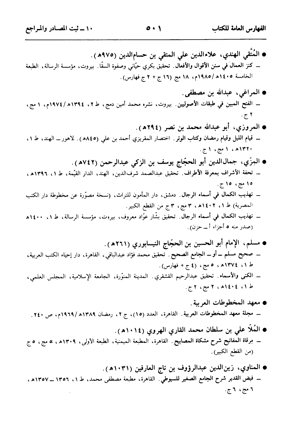 - كنز العمال فى سنن الأقوال والأفعال. تحقيق بكري حيّاني وصفرة السقّا. بيروت، مؤسسة الرسالة، الطبعة الخامسة 1405 هـ/ 1985 م، 18 مج (16 ج + 2 ج فهارس).