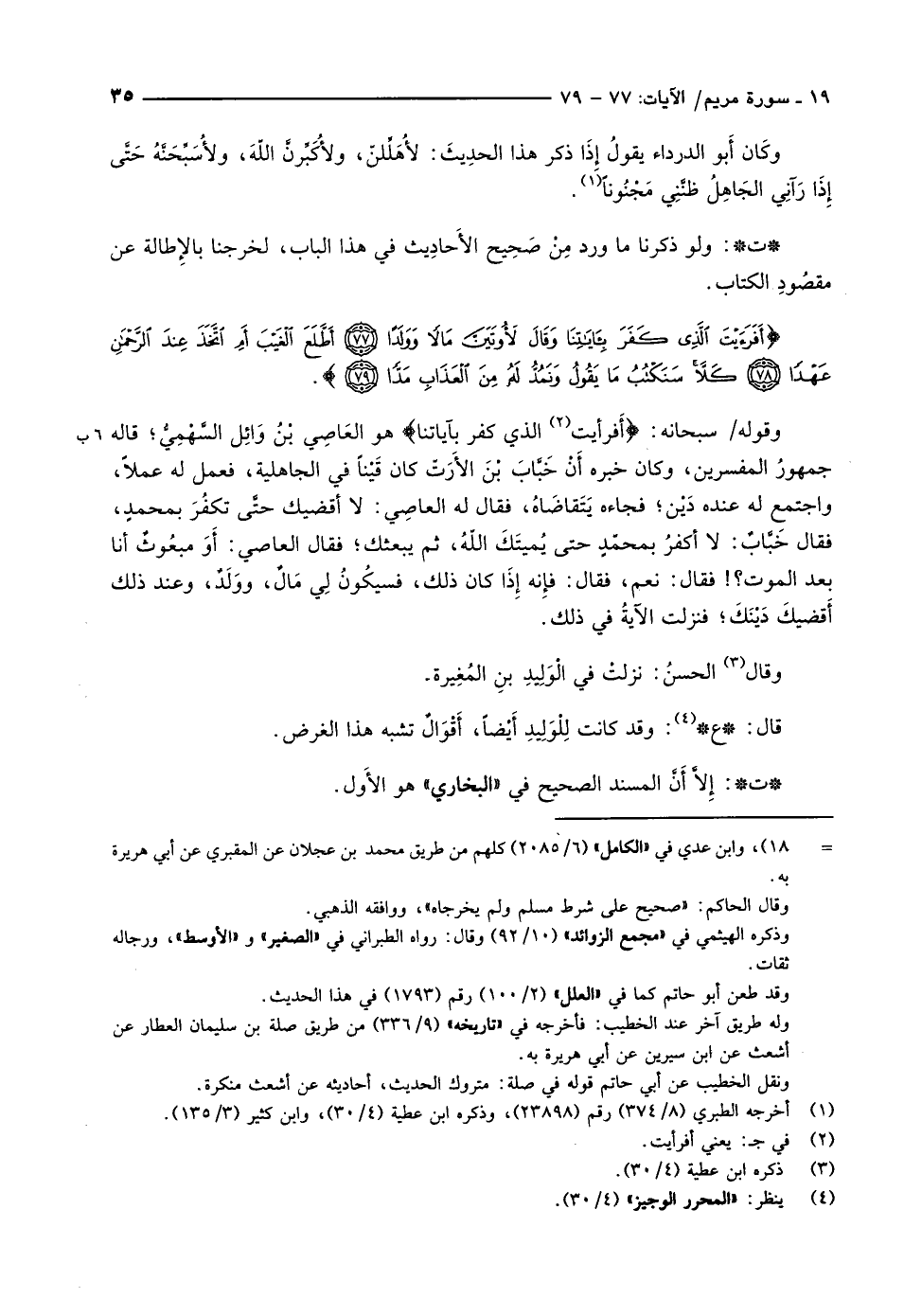 أَفَرَأَيْتَ الَّذِي كَفَرَ بِآياتِنا وَقالَ لَأُوتَيَنَّ مالاً وَوَلَداً (77) أَطَّلَعَ الْغَيْبَ أَمِ اتَّخَذَ عِنْدَ الرَّحْمنِ عَهْداً (78) كَلاَّ سَنَكْتُبُ ما يَقُولُ وَنَمُدُّ لَهُ مِنَ الْعَذابِ مَدًّا (79)