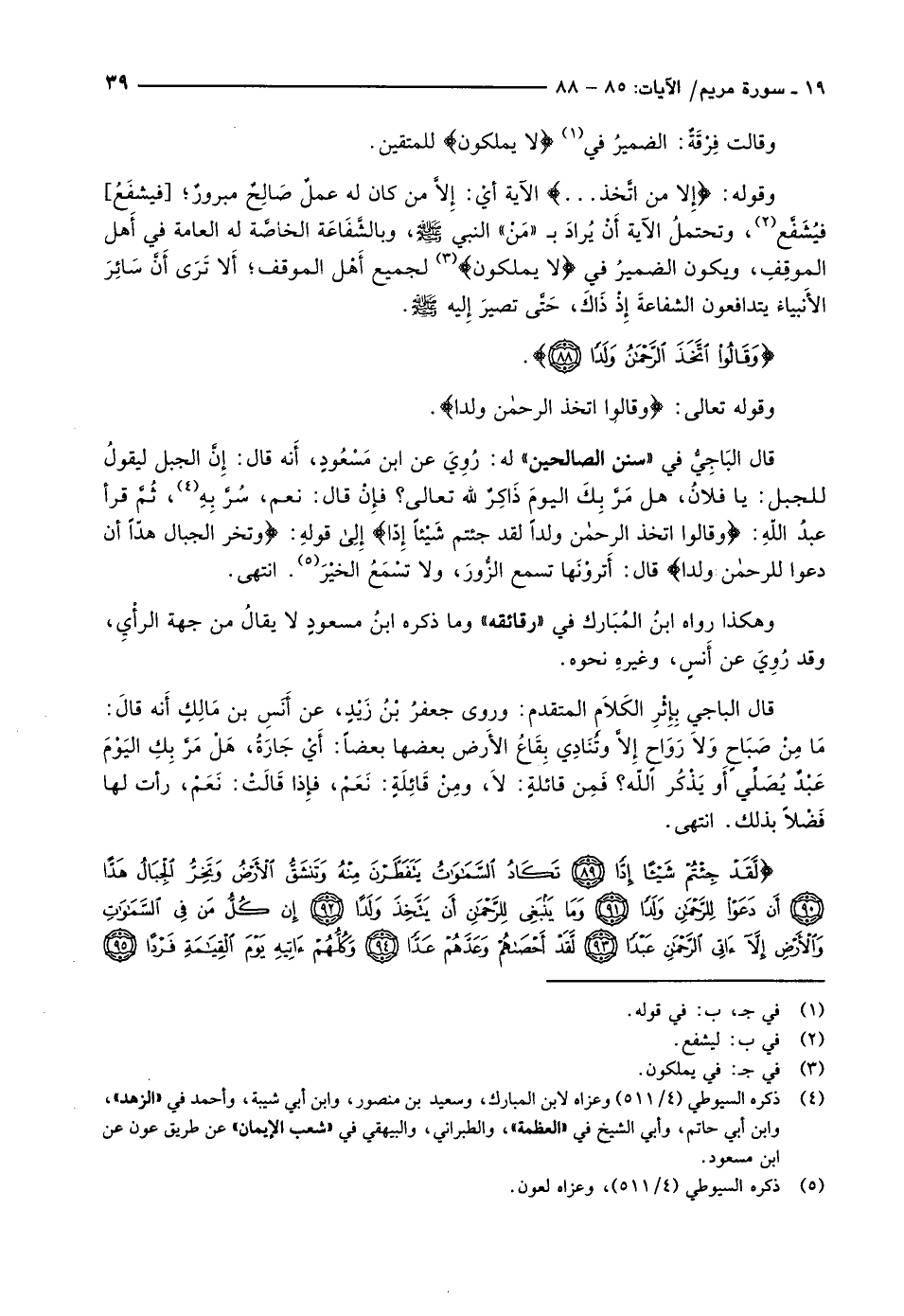 قال البَاجِيُّ في «سنن الصالحين» له: رُوِيَ عن ابن مَسْعُودٍ، أَنه قال: إنَّ الجبل ليقولُ للجبل: يا فلانُ، هل مَرَّ بِكَ اليومَ ذَاكِرٌ لله تعالى؟ فإنْ قال: نعم، سُرَّ بِهِ «4» ، ثُمَّ قرأ عبدُ اللهِ: وَقالُوا اتَّخَذَ الرَّحْمنُ وَلَداً لَقَدْ جِئْتُمْ شَيْئاً إِدًّا إلى قولهِ: وَتَخِرُّ الْجِبالُ هَدًّا أَنْ دَعَوْا لِلرَّحْمنِ وَلَداً قال: أَتروْنَها تسمع الزُّورَ، ولا تسْمَعُ الخيْرَ «5» . انتهى.