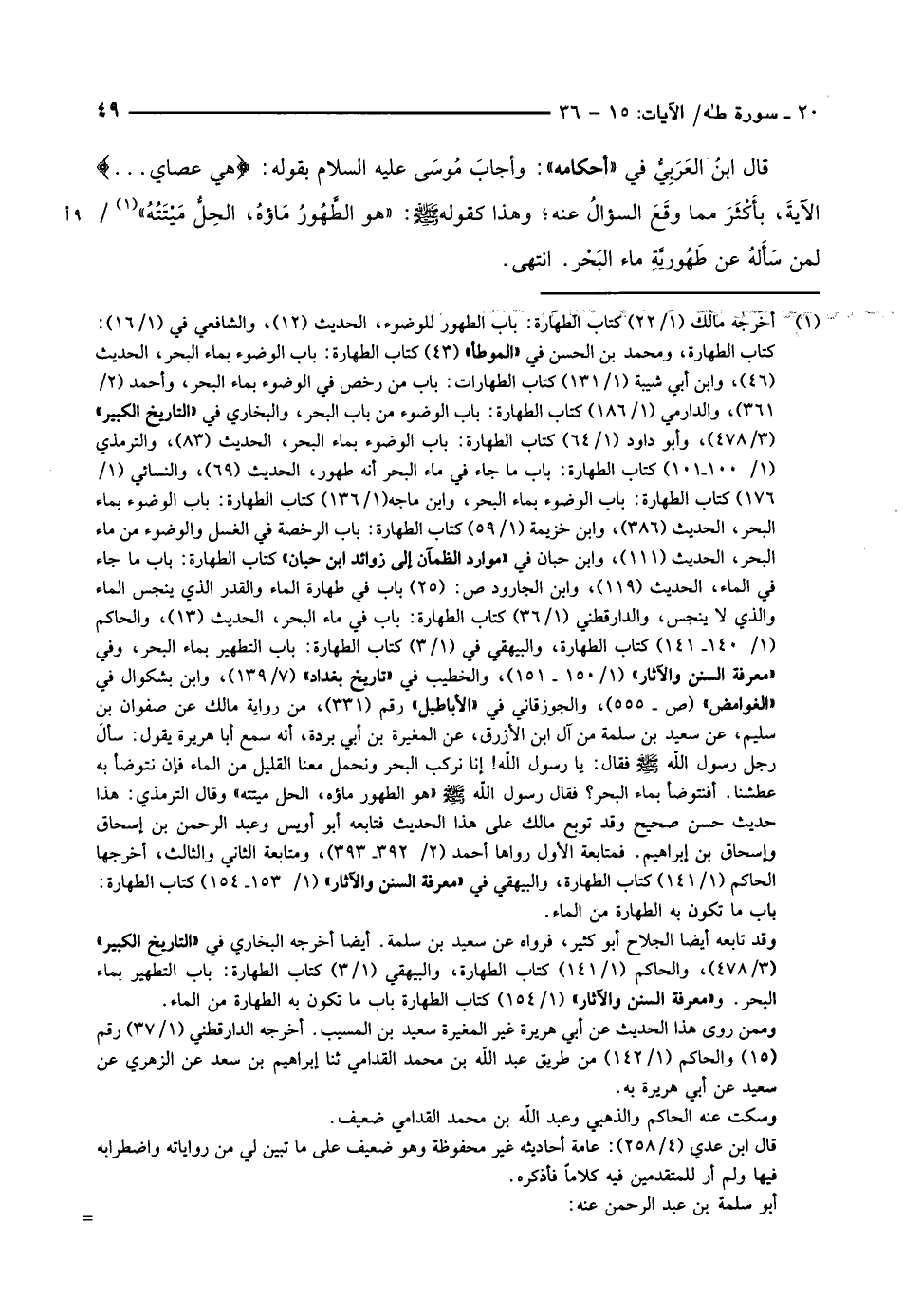 كتاب الطهارة، ومحمد بن الحسن في «الموطأ» (43) كتاب الطهارة: باب الوضوء بماء البحر، الحديث (46) ، وابن أبي شيبة (1/ 131) كتاب الطهارات: باب من رخص في الوضوء بماء البحر، وأحمد (2/ 361) ، والدارمي (1/ 186) كتاب الطهارة: باب الوضوء من باب البحر، والبخاري في «التاريخ الكبير» (3/ 478) ، وأبو داود (1/ 64) كتاب الطهارة: باب الوضوء بماء البحر، الحديث (83) ، والترمذي (1/ 100- 101) كتاب الطهارة: باب ما جاء في ماء البحر أنه طهور، الحديث (69) ، والنسائي (1/ 176) كتاب الطهارة: باب الوضوء بماء البحر، وابن ماجه (1/ 136) كتاب الطهارة: باب الوضوء بماء البحر، الحديث (386) ، وابن خزيمة (1/ 59) كتاب الطهارة: باب الرخصة في الغسل والوضوء من ماء البحر، الحديث (111) ، وابن حبان في «موارد الظمآن إلى زوائد ابن حبان» كتاب الطهارة: باب ما جاء في الماء، الحديث (119) ، وابن الجارود ص: (25) باب في طهارة الماء والقدر الذي ينجس الماء والذي لا ينجس، والدارقطني (1/ 36) كتاب الطهارة: باب في ماء البحر، الحديث (13) ، والحاكم (1/ 140- 141) كتاب الطهارة، والبيهقي في (1/ 3) كتاب الطهارة: باب التطهير بماء البحر، وفي «معرفة السنن والآثار» (1/ 150- 151) ، والخطيب في «تاريخ بغداد» (7/ 139) ، وابن بشكوال في «الغوامض» (ص- 555) ، والجوزقاني في «الأباطيل» رقم (331) ، من رواية مالك عن صفوان بن سليم، عن سعيد بن سلمة من آل ابن الأزرق، عن المغيرة بن أبي بردة، أنه سمع أبا هريرة يقول: سأل رجل رسول الله صلى الله عليه وسلّم فقال: يا رسول الله! إنا نركب البحر ونحمل معنا القليل من الماء فإن نتوضأ به عطشنا. أفنتوضأ بماء البحر؟ فقال رسول الله صلى الله عليه وسلّم «هو الطهور ماؤه، الحل ميتته» وقال الترمذي: هذا حديث حسن صحيح وقد توبع مالك على هذا الحديث فتابعه أبو أويس وعبد الرحمن بن إسحاق وإسحاق بن إبراهيم. فمتابعة الأول رواها أحمد (2/ 392- 393) ، ومتابعة الثاني والثالث، أخرجها الحاكم (1/ 141) كتاب الطهارة، والبيهقي في «معرفة السنن والآثار» (1/ 153- 154) كتاب الطهارة: