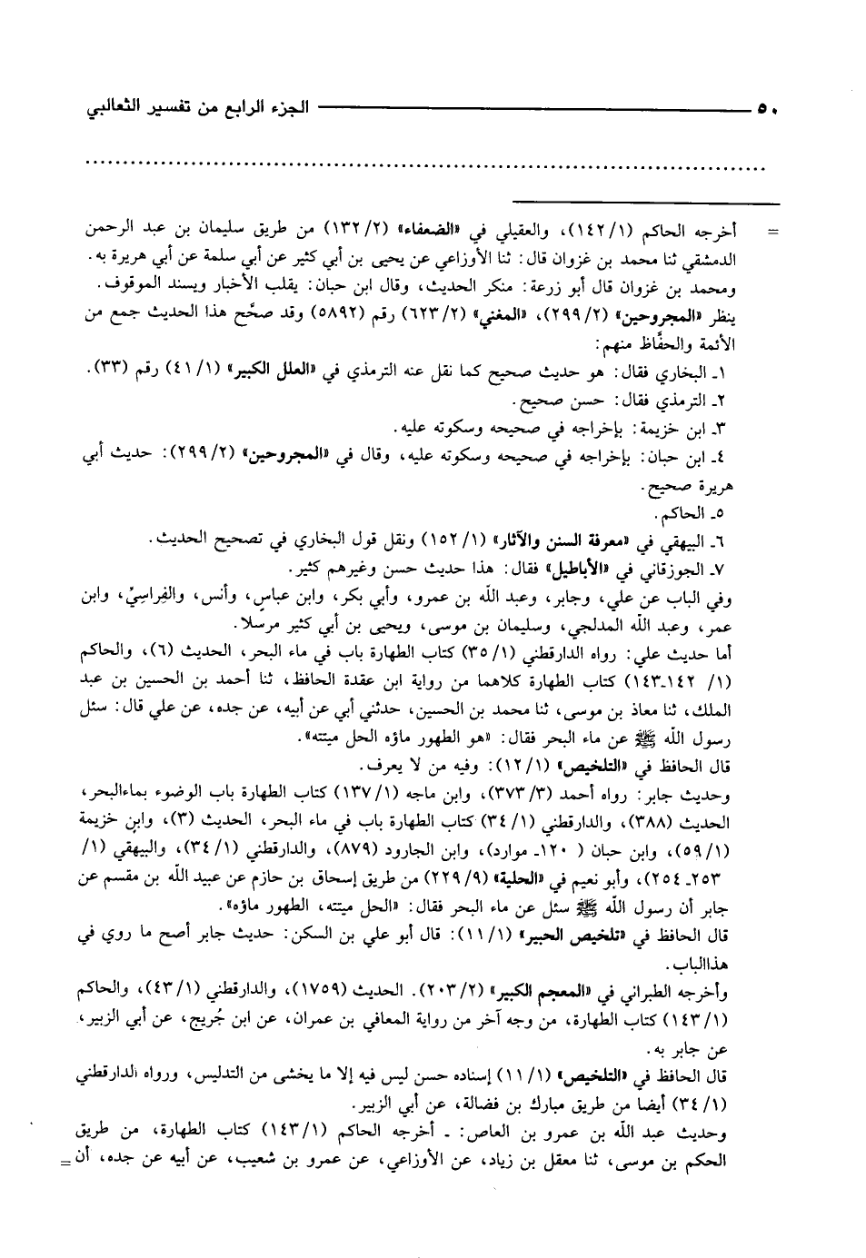 وحديث جابر: رواه أحمد (3/ 373) ، وابن ماجه (1/ 137) كتاب الطهارة باب الوضوء بماء البحر، الحديث (388) ، والدارقطني (1/ 34) كتاب الطهارة باب في ماء البحر، الحديث (3) ، وابن خزيمة (1/ 59) ، وابن حبان (120- موارد) ، وابن الجارود (879) ، والدارقطني (1/ 34) ، والبيهقي (1/ 253- 254) ، وأبو نعيم في «الحلية» (9/ 229) من طريق إسحاق بن حازم عن عبيد الله بن مقسم عن جابر أن رسول الله صلى الله عليه وسلّم سئل عن ماء البحر فقال: «الحل ميتته، الطهور ماؤه» .