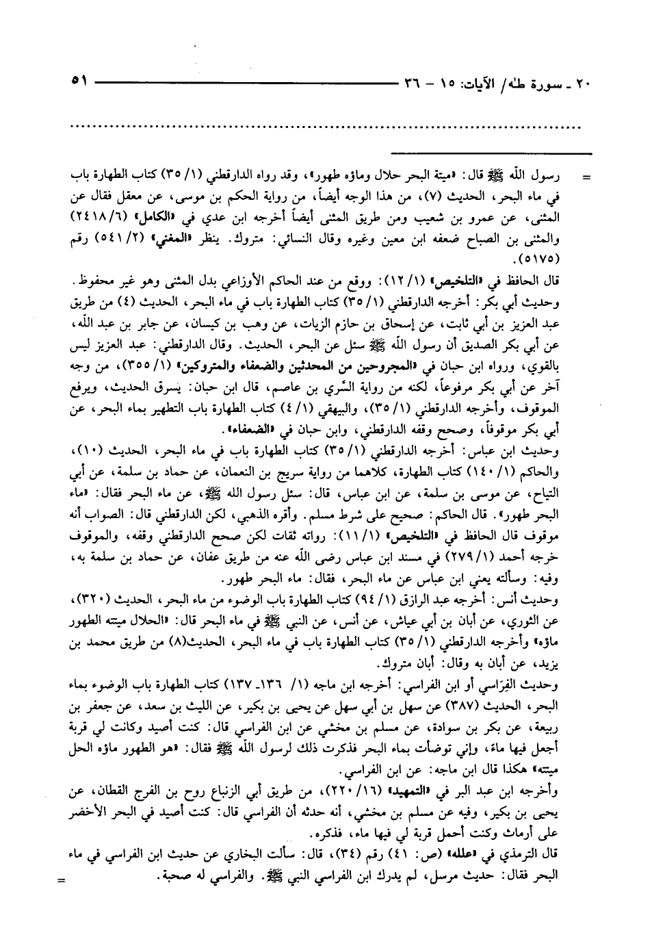 وحديث ابن عباس: أخرجه الدارقطني (1/ 35) كتاب الطهارة باب في ماء البحر، الحديث (10) ، والحاكم (1/ 140) كتاب الطهارة، كلاهما من رواية سريج بن النعمان، عن حماد بن سلمة، عن أبي التياح، عن موسى بن سلمة، عن ابن عباس، قال: سئل رسول الله صلى الله عليه وسلّم، عن ماء البحر فقال: «ماء البحر طهور» . قال الحاكم: صحيح على شرط مسلم. وأقره الذهبي، لكن الدارقطني قال: الصواب أنه موقوف قال الحافظ في «التلخيص» (1/ 11) : رواته ثقات لكن صحح الدارقطني وقفه، والموقوف خرجه أحمد (1/ 279) في مسند ابن عباس رضى الله عنه من طريق عفان، عن حماد بن سلمة به، وفيه: وسألته يعني ابن عباس عن ماء البحر، فقال: ماء البحر طهور.