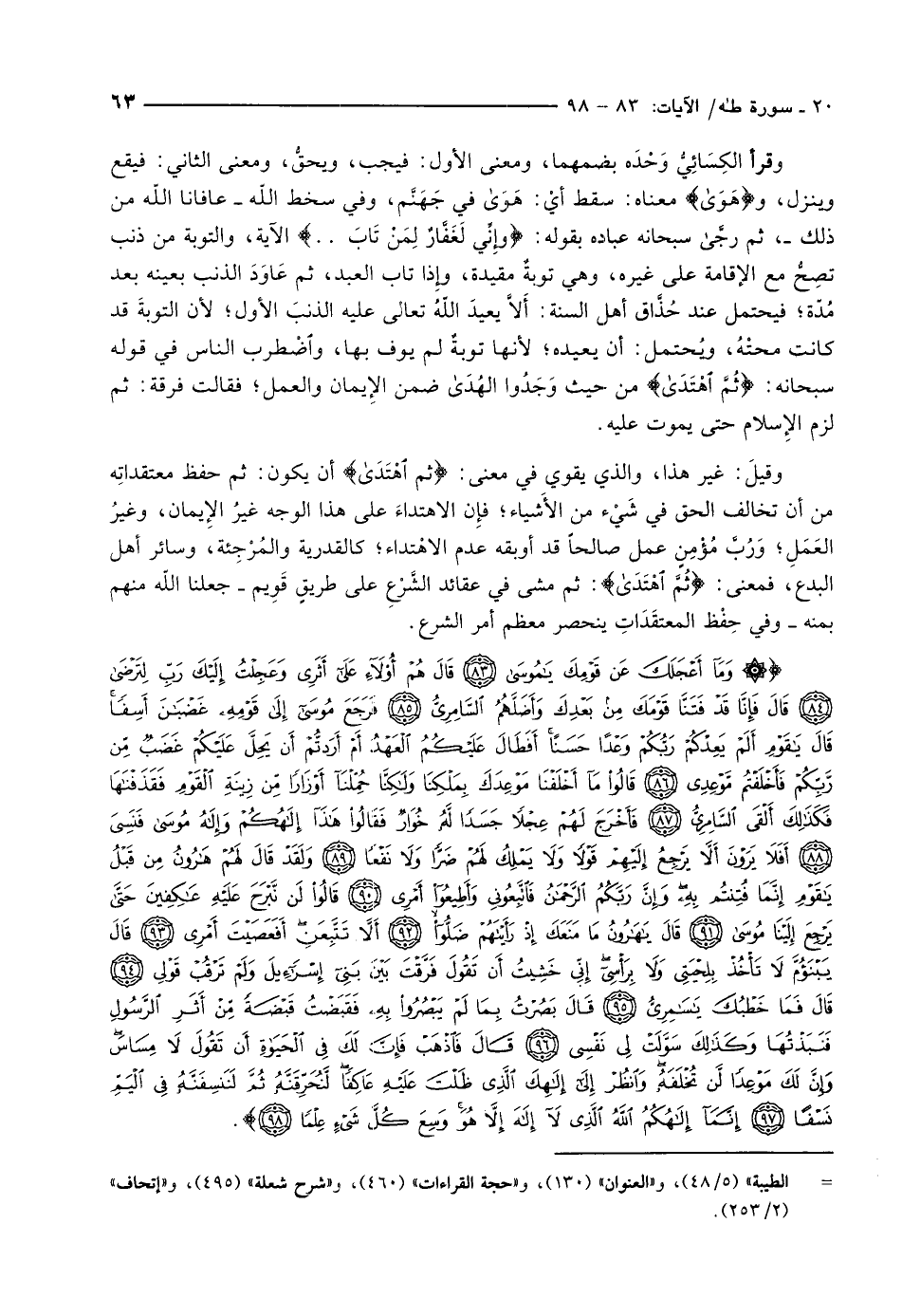 وقرأ الكِسَائِيُّ وَحْدَه بضمهما، ومعنى الأول: فيجب، ويحقّ، ومعنى الثاني: فيقع وينزل، وهَوى معناه: سقط أيْ: هوى في جَهَنَّم، وفي سخط الله- عافانا الله من ذلك-، ثم رجى سبحانه عباده بقوله: وَإِنِّي لَغَفَّارٌ لِمَنْ تابَ ... الآية، والتوبة من ذنب تصح مع الإقامة على غيره، وهي توبة مقيدة، وإذا تاب العبد، ثم عَاوَدَ الذنب بعينه بعد مُدّة فيحتمل عند حُذَّاق أهل السنة: أَلاَّ يعيدَ اللهُ تعالى عليه الذنبَ الأول لأن التوبةَ قد كانت محْتهُ، ويُحتمل: أن يعيده لأنها توبةٌ لم يوف بها، واضطرب الناس في قوله سبحانه: ثُمَّ اهْتَدى من حيث وَجَدُوا الهدى ضمن الإيمان والعمل فقالت فرقة: ثم لزم الإسلام حتى يموت عليه.