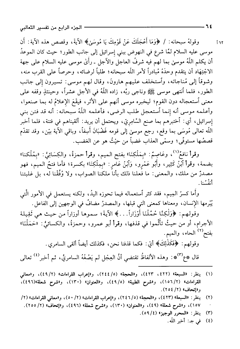 وقولهم: وَلكِنَّا حُمِّلْنا أَوْزاراً ... الآية سموها أوزاراً من حيث هي ثَقِيلة الأجرام، أو من حيثُ تأَثَّموا في قذفها، وقرأ أبو عمرو، وحمزةُ، والكسائيُّ: «حَمَلْنَا» بفتح «2» الحاء، والميم.