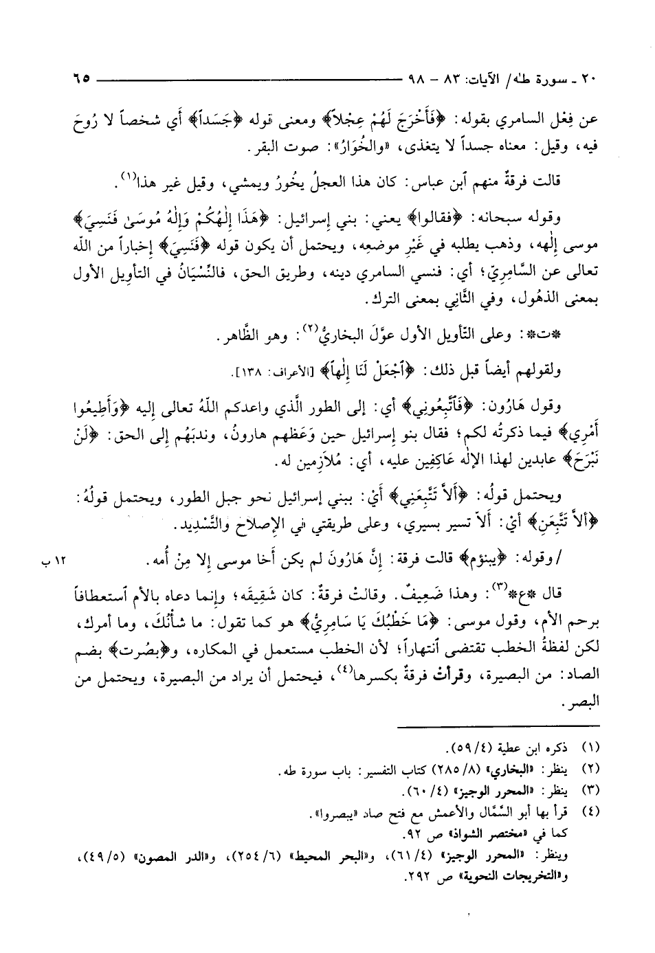 (2) ينظر: «البخاري» (8/ 285) كتاب التفسير: باب سورة طه.
