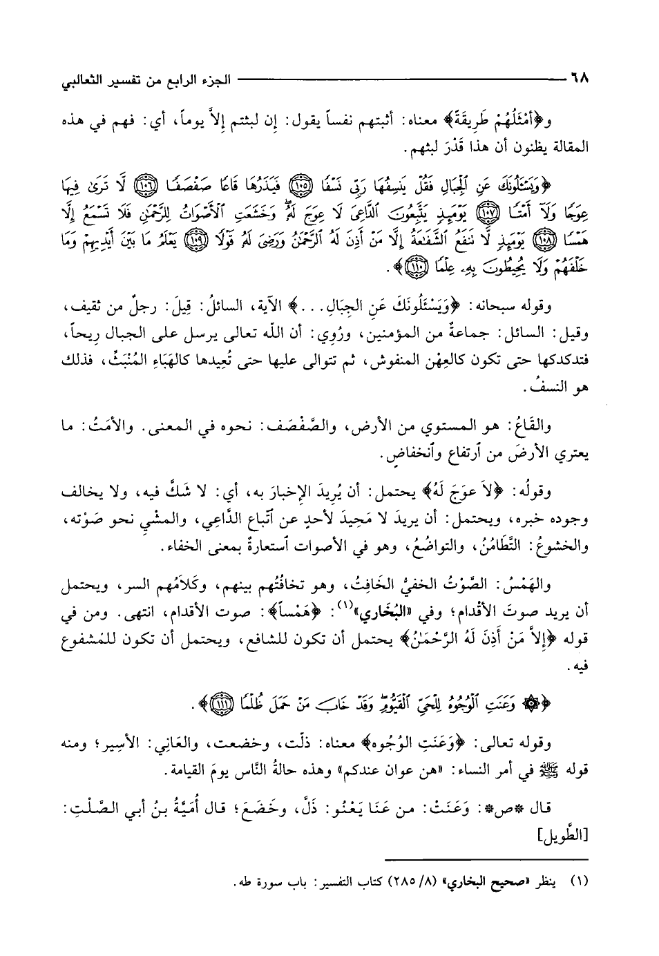 وَيَسْئَلُونَكَ عَنِ الْجِبالِ فَقُلْ يَنْسِفُها رَبِّي نَسْفاً (105) فَيَذَرُها قاعاً صَفْصَفاً (106) لا تَرى فِيها عِوَجاً وَلا أَمْتاً (107) يَوْمَئِذٍ يَتَّبِعُونَ الدَّاعِيَ لا عِوَجَ لَهُ وَخَشَعَتِ الْأَصْواتُ لِلرَّحْمنِ فَلا تَسْمَعُ إِلاَّ هَمْساً (108) يَوْمَئِذٍ لا تَنْفَعُ الشَّفاعَةُ إِلاَّ مَنْ أَذِنَ لَهُ الرَّحْمنُ وَرَضِيَ لَهُ قَوْلاً (109)