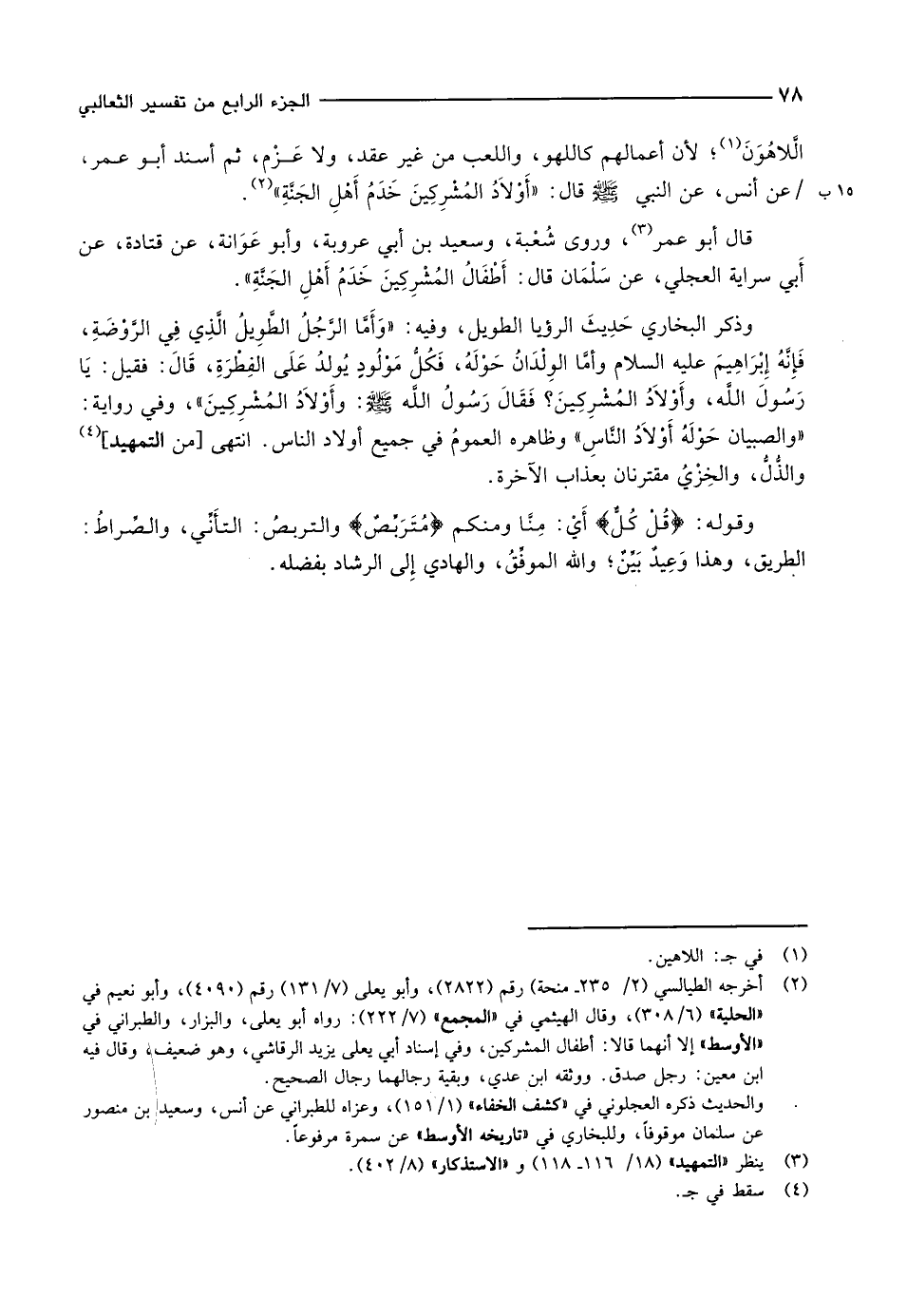 الَّلاهُوَنَ «1» لأن أعمالهم كاللهو، واللعب من غير عقد، ولا عَزْم، ثم أسند أبو عمر، 15 ب/ عن أنس، عن النبي صلى الله عليه وسلّم قال: «أَوْلاَدُ المُشْرِكِينَ خَدَمُ أَهْلِ الجَنَّةِ» «2» .