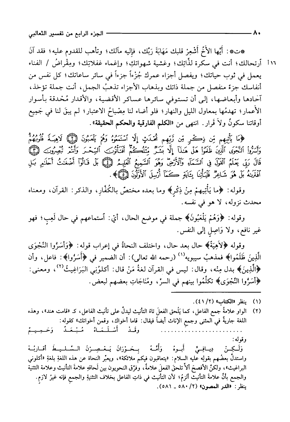 وقوله لاهِيَةً حال بعد حال، واختلف النحاةُ في إعراب قوله: وَأَسَرُّوا النَّجْوَى الَّذِينَ ظَلَمُوا فمذهبُ سيبويه «1» (رحمه الله تعالى) : أن الضمير في أَسَرُّوا: فاعل، وأن الَّذِينَ بدل مِنْه، وقال: ليس في القرآن لغةُ مَنْ قال: أكلوُنِي البَرَاغِيثُ «2» ، ومعنى: