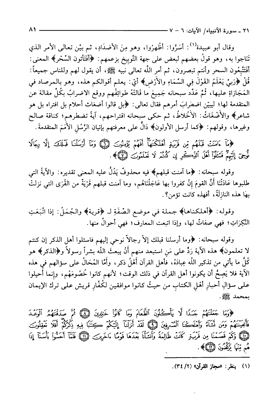 ما آمَنَتْ قَبْلَهُمْ مِنْ قَرْيَةٍ أَهْلَكْناها أَفَهُمْ يُؤْمِنُونَ (6) وَما أَرْسَلْنا قَبْلَكَ إِلاَّ رِجالاً نُوحِي إِلَيْهِمْ فَسْئَلُوا أَهْلَ الذِّكْرِ إِنْ كُنْتُمْ لا تَعْلَمُونَ (7)