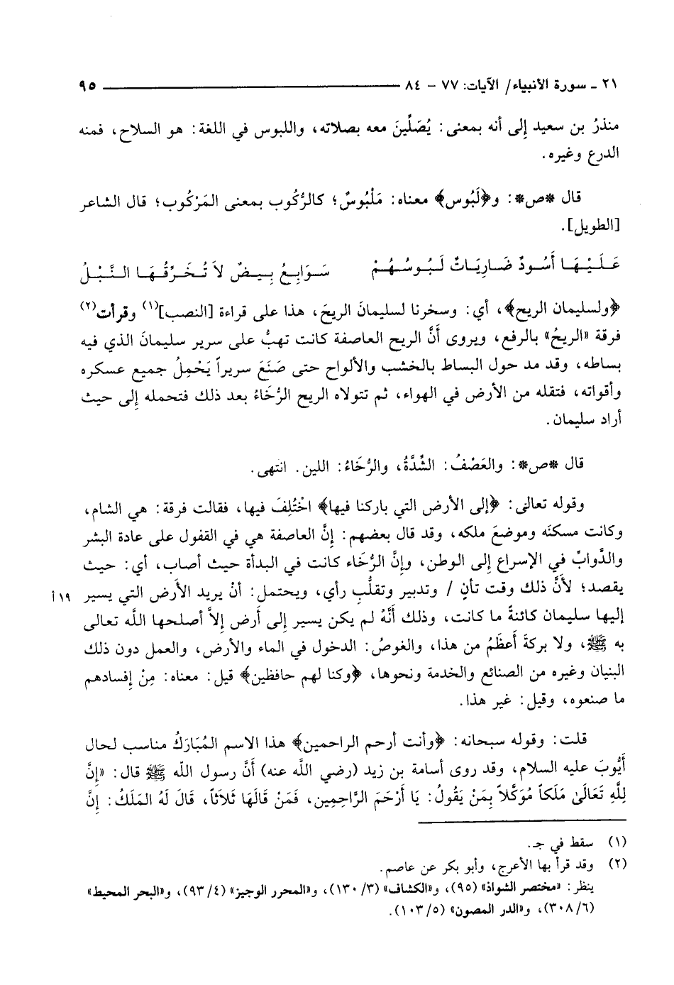 وقوله تعالى: إِلى الْأَرْضِ الَّتِي بارَكْنا فِيها اخْتُلِفَ فيها، فقالت فرقة: هي الشام، وكانت مسكنَه وموضعَ ملكه، وقد قال بعضهم: إنَّ العاصفة هي في القفول على عادة البشر والدَّوابِّ في الإسراع إلى الوطن، وإنَّ الرُّخَاء كانت في البدأة حيث أصاب، أي: حيث يقصد لأَنَّ ذلك وقت تأنٍ/ وتدبير وتقلُّبِ رأي، ويحتمل: أنْ يريد الأَرض التي يسير 19 أإليها سليمان كائنةً ما كانت، وذلك أَنَّهُ لم يكن يسير إلى أَرض إلاَّ أصلحها اللَّه تعالى به صلى الله عليه وسلّم، ولا بركةَ أَعظَمُ من هذا، والغوصُ: الدخول في الماء والأرض، والعمل دون ذلك البنيان وغيره من الصنائع والخدمة ونحوها، وَكُنَّا لَهُمْ حافِظِينَ قيل: معناه: مِنْ إفسادهم ما صنعوه، وقيل: غير هذا.