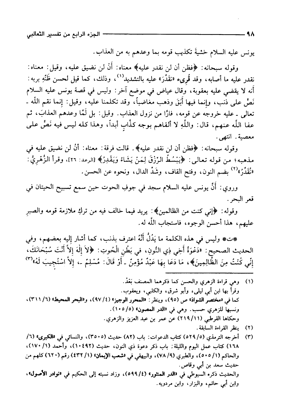 ت وليس في هذه الكلمة ما يَدُلُّ أَنَّهُ اعترف بذنب، كما أشار إليه بعضهم، وفي الحديث الصحيح: «دَعْوَةُ أَخِي ذِي النُّونِ، في بَطْنِ الْحُوتِ: لاَ إِلهَ إِلَّا أَنْتَ سُبْحانَكَ، إِنِّي كُنْتُ مِنَ الظَّالِمِينَ، مَا دَعَا بِهَا عَبْدٌ مُؤْمِنٌ- أَوْ قَالَ: مُسْلِمٌ-، إلاَّ اسْتُجِيبَ لَهُ» «3»