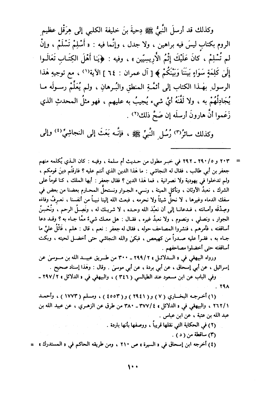 = 203 و5/ 390 - 292 في خبر مطول من حديث أم سلمة، وفيه: كان الذي يُكلمه منهم جعفر بن أبي طالب، فقال له النجاشي: ما هذا الدين الذي أنتم عليه؟ فارقتُم دينَ قومكم، ولم تدخلوا في يهودية ولا نصرانية، فما هذا الدين؟ فقال جعفر: أيها الملك، كنا قوماً على الشرك، نعبدُ الأوثان، ونأكل الميتة، ونسيء الجوار ونستحلُّ المحارم بعضنا من بعض في سفك الدماء وغيرها، لا نحلُّ شيئاً ولا نحرمه، فبعث الله إلينا نبياً من أنفسنا، نعرِفُ وفاءَه وصِدْقَه وأمانته، فدعانا إلى أن نعبُدَ الله وحده، لا شريك له، ونصِلُ الرحم، ونُحْسِنُ الجوار، ونصلي، ونصوم، ولا نعبدُ غيره، فقال: هل معك شيءٌ ممَّا جاء به؟ وقد دعا أساقفته، فأمرهم، فنشروا المصاحف حوله، فقال له جعفر: نعم، قال: هلم، فَاتْلُ عليَّ ما جاء به، فقرأ عليه صدراً من كهيعص، فبكى والله النجاشي حتى أخضل لحيته، وبكت أساقفته حتى أخضلوا مصاحفهم.