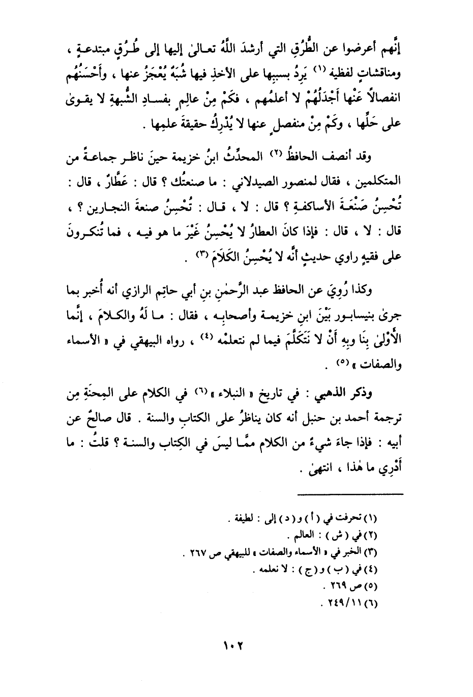 وكذا رُوِيَ عن الحافظ عبد الرحمن بن أبي حاتم الرازي أنه أُخبر بما جرى بنيسابور بين ابن خزيمة وأصحابه، فقال: ما له والكلام، إنما الأولى بنا وبه أن لا نتكلَّم فيما لم نتعلمه (¬4)، رواه البيهقي في " الأسماء والصفات " (¬5).