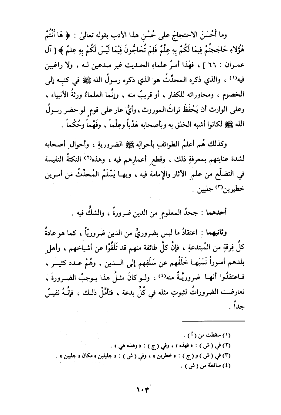 وثانيهما: اعتقاد ما ليس بضروري من الدين ضرورياً، كما هو عادة كلِّ فرقةٍ من المبتدعة، فإن كل طائفة منهم قد تَلَقَّوا عن أشياخهم، وأهلِ بلدهم أموراً نسبها خلفُهم عن سلفهم إلى الدين، وهم عدد كثير، فاعتقدوا أنها ضرورية منه (¬4)، ولو كان مثل هذا يوجب الضرورة، تعارضت الضرورات لثبوت مثله في كل بدعة، فتأمل ذلك، فإنه نفيسٌ جداً.