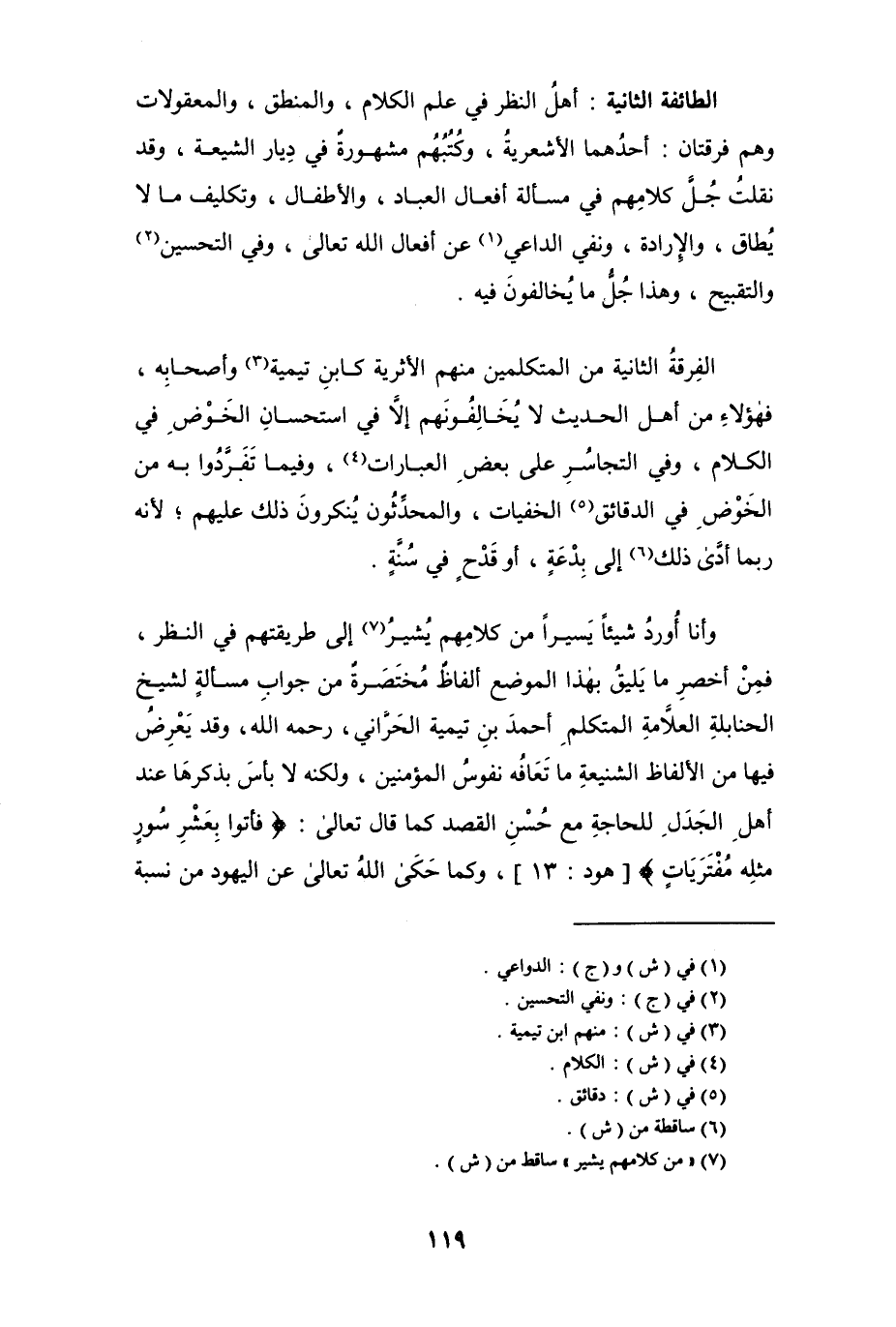 الفرقة الثانية من المتكلمين منهم الأثرية كابن تيمية (¬3) وأصحابه، فهؤلاء من أهل الحديث لا يُخالفونهم إلاَّ في استحسان الخوض في الكلام، وفي التجاسُر على بعض العبارات (¬4)، وفيما تفرَّدُوا به من الخوض في الدقائق (¬5) الخفيات، والمحدِّثون ينكرون ذلك عليهم؛ لأنه ربما أدى ذلك (¬6) إلى بدعةٍ، أو قدحٍ في سُنَّةٍ.