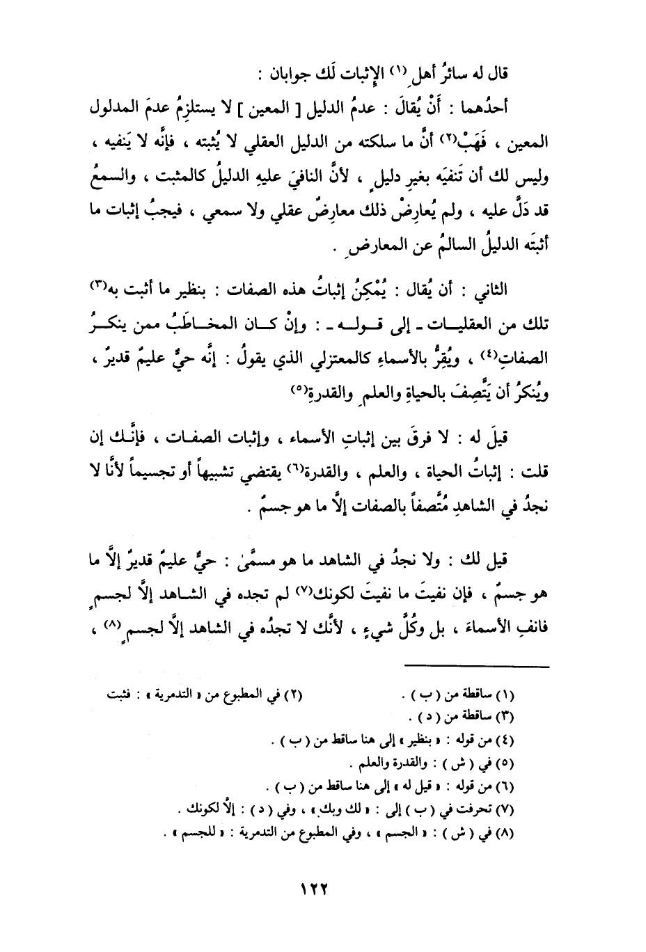 الثاني: أن يُقال: يُمكنُ إثبات هذه الصفات: بنظير ما أثبت به (¬3) تلك من العقليات -إلى قوله-: وإن كان المخاطب ممن ينكر الصفات (¬4)، ويُقِرُّ بالأسماء كالمعتزلي الذي يقولُ: إنه حيٌّ عليمٌ قديرٌ، وينكر أن يتَّصف بالحياة والعلم والقدرة (¬5)