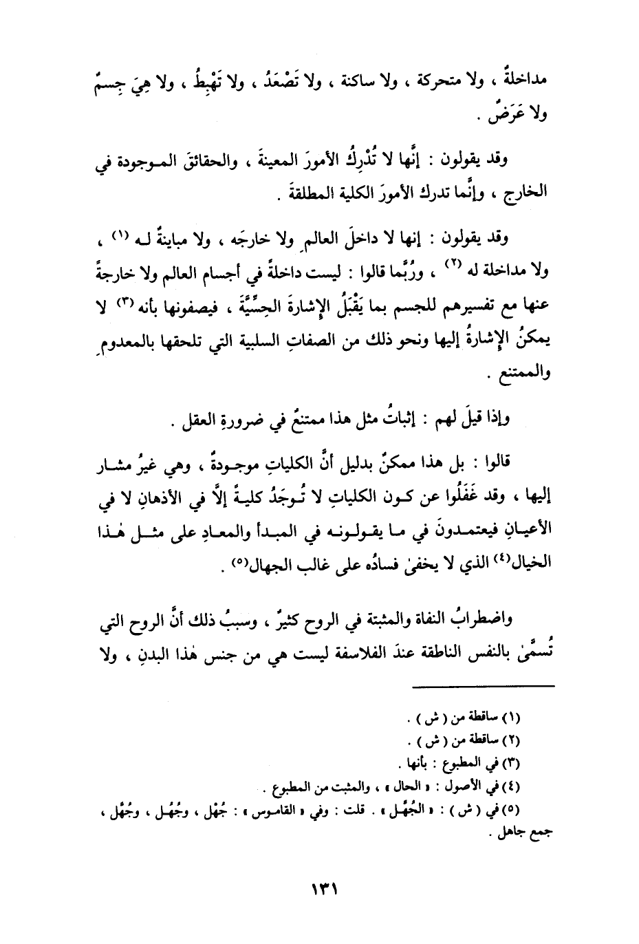 قالوا: بل هذا ممكنٌ بدليل أن الكليات موجودة، وهي غير مشار إليها، وقد غفلوا عن كون الكليات لا توجد كلية إلاَّ في الأذهان لا في الأعيان فيعتمدون في ما يقولونه في المبدأ والمعاد على مثل هذا الخيال (¬4) الذي لا يخفى فسادُه على غالب الجهال (¬5).