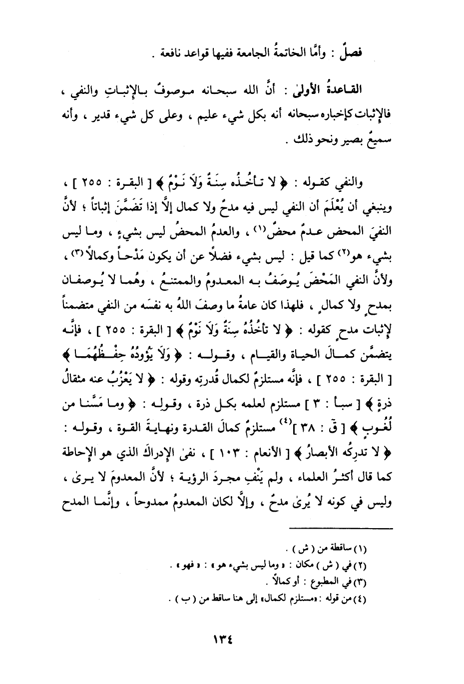 والنفي كقوله: {لَا تَأْخُذُهُ سِنَةٌ وَلَا نَوْمٌ} [البقرة: 255]، وينبغي أن يُعلم أن النفي ليس فيه مدحٌ ولا كمال إلاَّ إذا تضمَّن إثباتاً؛ لأن النفي المحض عدمٌ محضٌ (¬1)، والعدم المحض ليس بشيءٍ، وما ليس بشيء هو (¬2) كما قيل: ليس بشيء فضلاً عن أن يكون مدحاً وكمالاً (¬3)، ولأنَّ النفي المحض يُوصَفُ به المعدوم والممتنع، وهما لا يُوصفان بمدحٍ ولا كمالٍ، فلهذا كان عامة ما وصف الله به نفسه من النفي متضمناً لإثبات مدحٍ كقوله: {لَا تَأْخُذُهُ سِنَةٌ وَلَا نَوْمٌ} [البقرة: 255]، فإنه يتضمن كمال الحياة والقيام، وقوله: {وَلَا يَئُودُهُ حِفْظُهُمَا} [البقرة: 255]، فإنه مستلزم لكمال قُدرته وقوله: {لَا يَعْزُبُ عَنْهُ مِثْقَالُ ذَرَّةٍ} [سبأ: 3] مستلزم لعلمه بكل ذرة، وقوله: {وَمَا مَسَّنَا مِنْ لُغُوبٍ} [ق: 38] (¬4) مستلزمٌ كمال القدرة ونهاية القوة، وقوله: {لَا تُدْرِكُهُ الْأَبْصَارُ} [الأنعام: 103]، نفى الإدراك الذي هو الإحاطة كما قال أكثر العلماء، ولم ينف مجرد الرؤية؛ لأن المعدوم لا يرى، وليس في كونه لا يرى مدحٌ، وإلا لكان المعدوم ممدوحاً، وإنما المدح