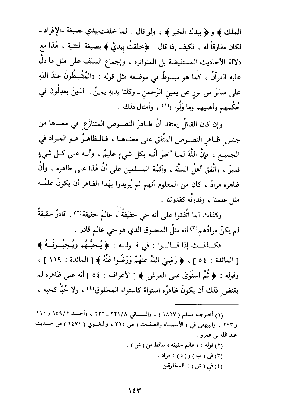 وإن كان القائلُ يعتقد أن ظاهر النصوص المتنازع في معناها من جنسِ ظاهر النصوص المتَّفق على معناها، فالظاهرُ هو المراد في الجميع، فإن الله لما أخبر أنه بكل شيءٍ عليمٌ، وأنه على كل شيءٍ قديرٌ، واتَّفق أهلُ السنَّة، وأئمة المسلمين على أن هذا على ظاهره، وأن ظاهره مرادٌ، كان من المعلوم أنهم لم يريدوا بهذا الظاهر أن يكون علمه مثلَ علمنا، وقدرتُه كقدرتنا.