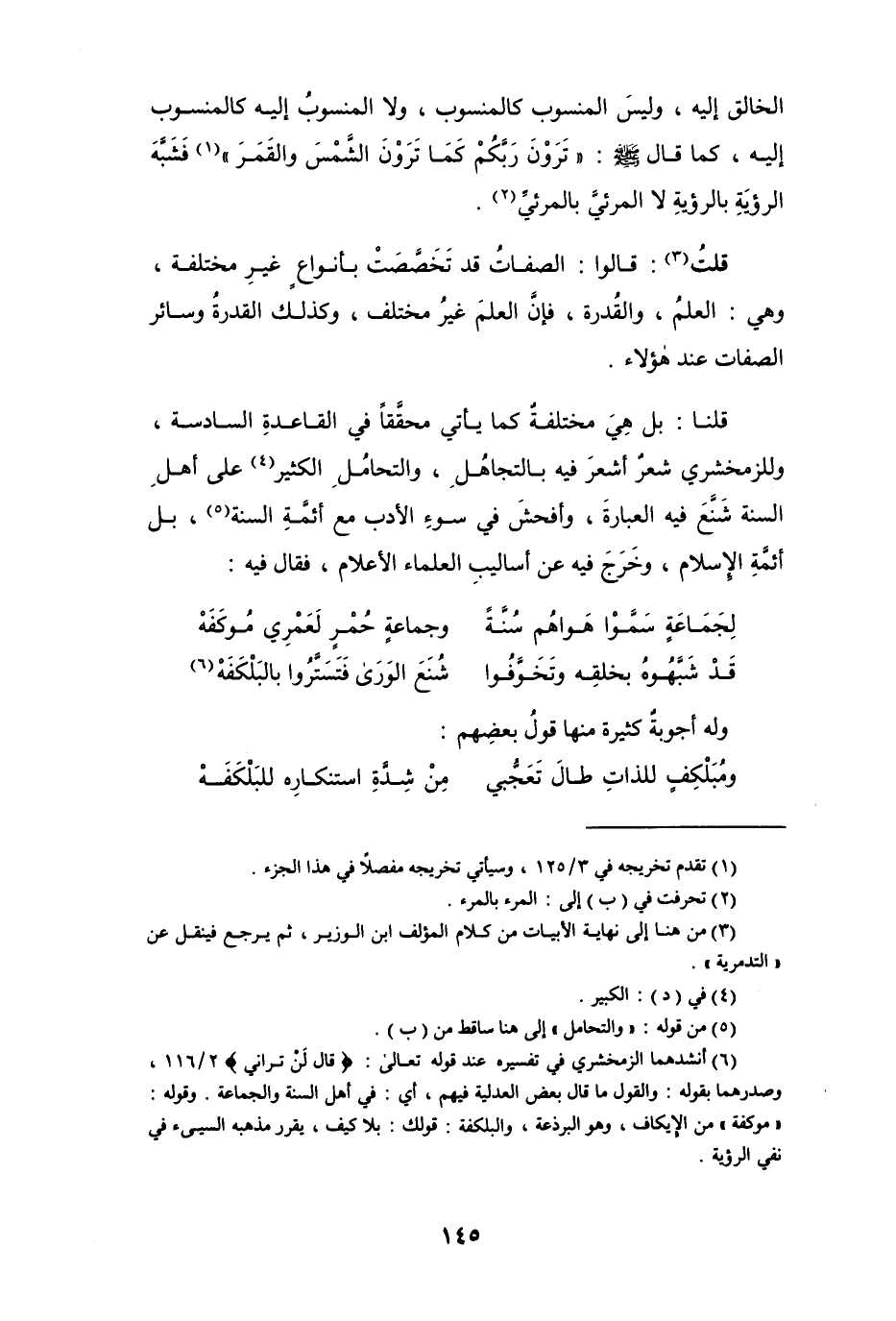 قلنا: بل هي مختلفةٌ كما يأتي محقَّقاً في القاعدة السادسة، وللزمخشري شعرٌ أشعر فيه بالتجاهُل، والتحامل الكثير (¬4) على أهل السنة شنَّع فيه العبارةَ، وأفحشَ في سوء الأدب مع أئمَّة السنة (¬5)، بل أئمَّةِ الإسلام، وخَرَجَ فيه عن أساليب العلماء الأعلام، فقال فيه: