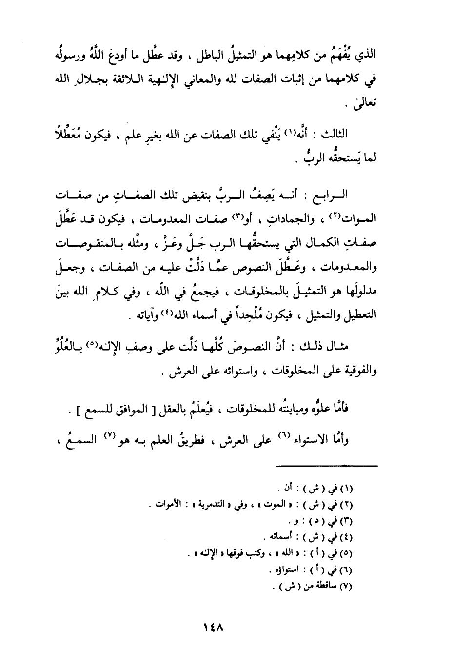الرابع: أنه يَصِفُ الربَّ بنقيض تلك الصفات من صفات الموات (¬2)، والجمادات، أو (¬3) صفات المعدومات، فيكون قد عَطَّلَ صفاتِ الكمال التي يستحقُّها الرب جلَّ وعزَّ، ومثَّله بالمنقوصات والمعدومات، وعطَّل النصوص عمَّا دلَّت عليه من الصفات، وجعل مدلولها هو التمثيل بالمخلوقات، فيجمعُ في الله، وفي كلام الله بين التعطيل والتمثيل، فيكون مُلحِداً في أسماء الله (¬4) وآياته.